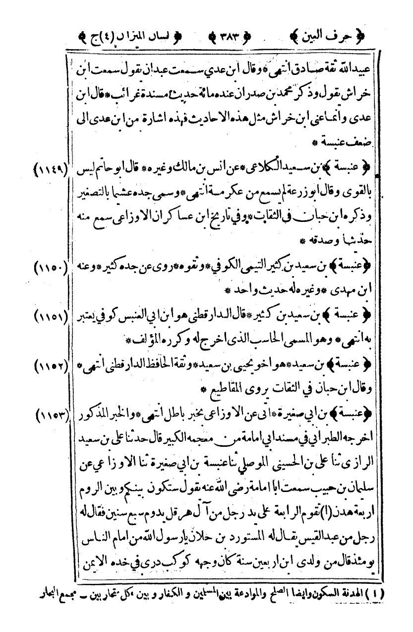 [1151] "عنبسة" بن سعيد بن كثير قال الدارقطني هو ابن أبي العنبس كوفي يعتبر به انتهى وهو المسمعي الحاسب الذي أخرج له وكره المؤلف.