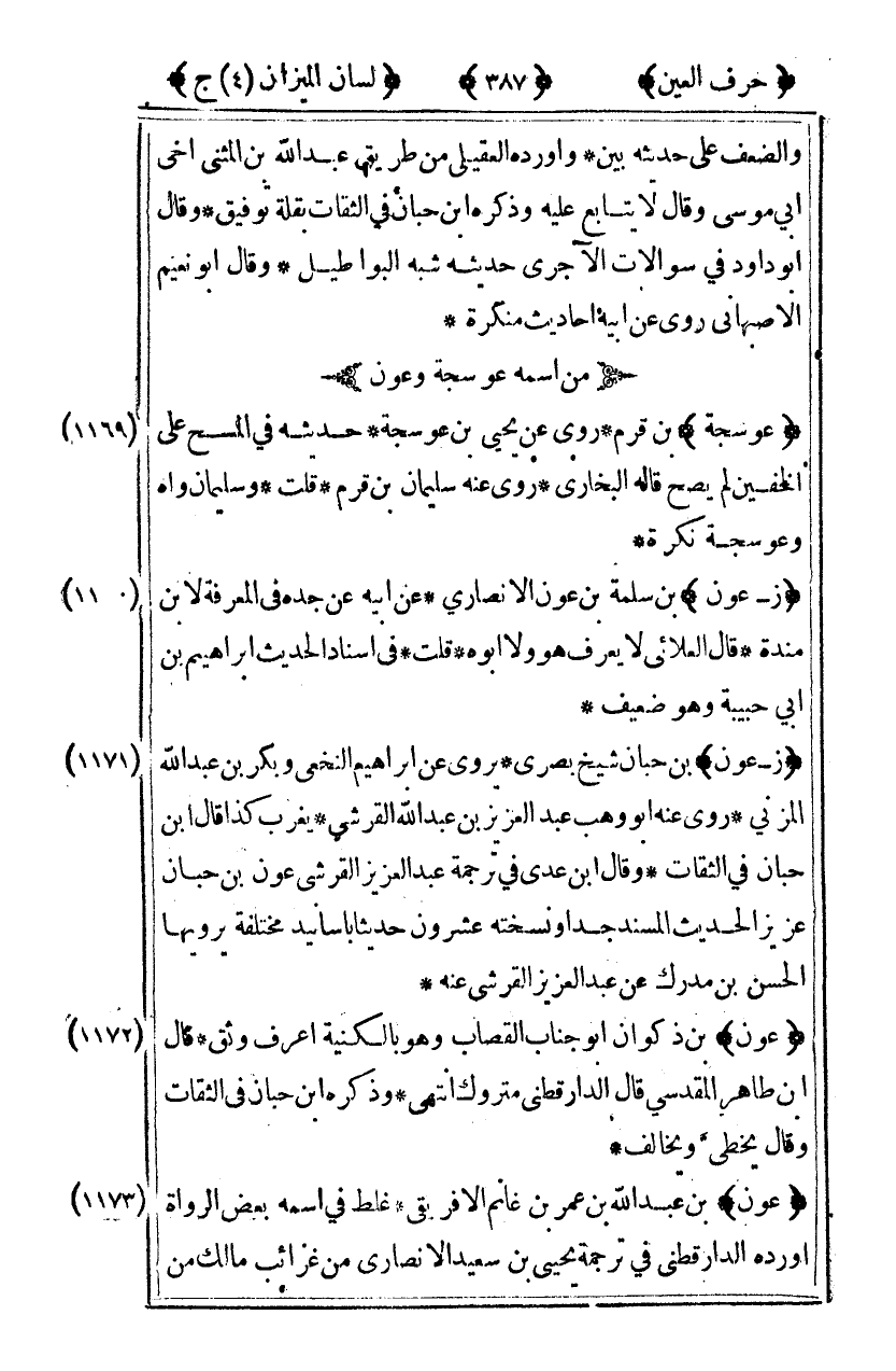 [1171] "زعون" بن حبان شيخ بصري يروي عن إبراهيم النخعي وبكر بن عبد الله المزني روى عنه أبو وهيب عبد العزيز بن عبد الله القرشي يغرب كذا قال ابن حبان في الثقات وقال ابن عدي في ترجمة عبد العزيز القرشي عون بن حبان عزيز الحديث المسند جدا ونسخته عشرون حديثا بأسانيد مختلفة يرويها الحسن بن مدرك عن عبد العزيز القرشي عنه.