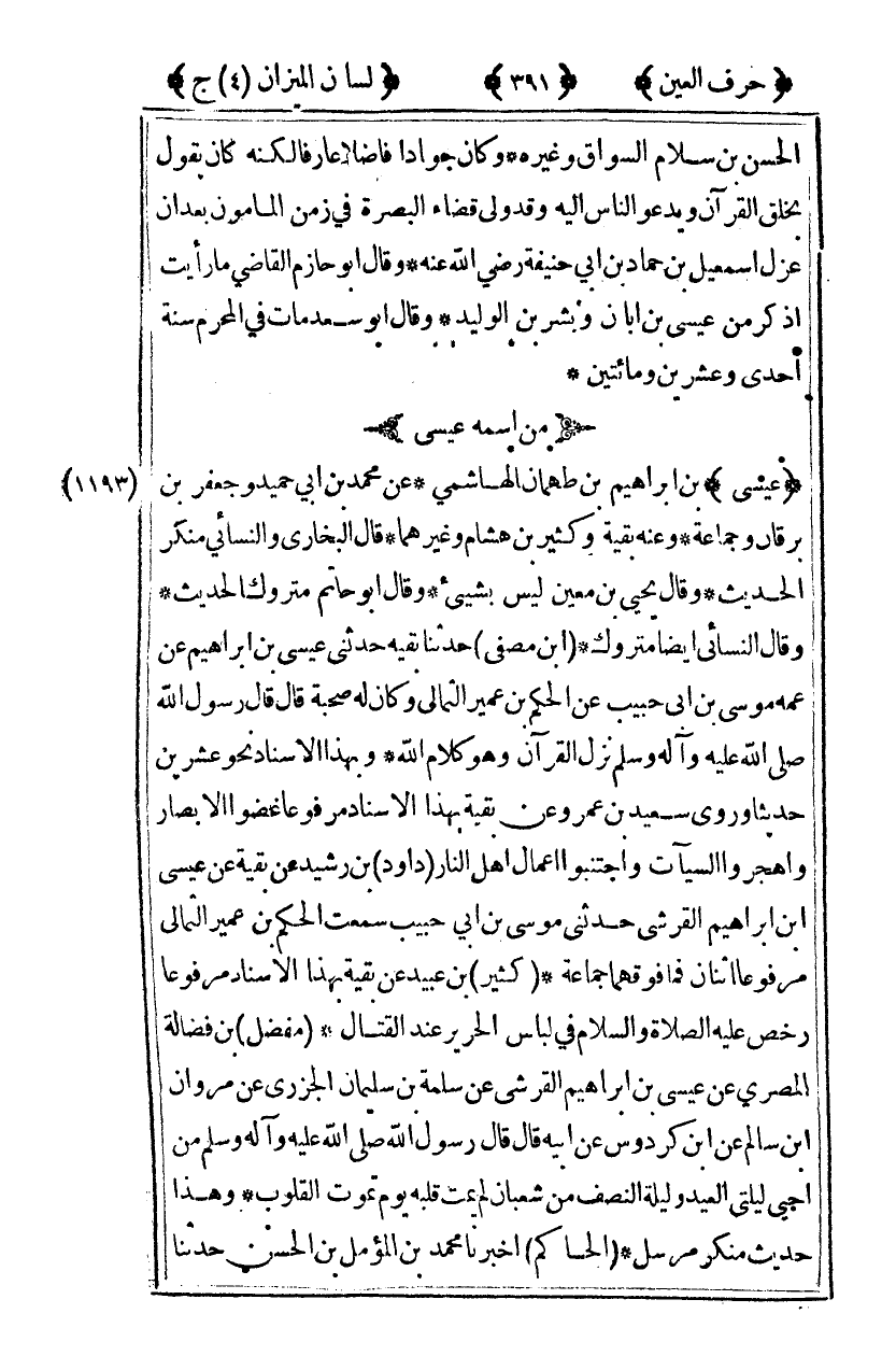 [1193] "عيسى" بن إبراهيم بن طهمان الهاشمي عن محمد بن أبي حميد وجعفر بن برقان وجماعة وعنه بقية وكثير بن هشام وغيرهما قال البخاري والنسائي منكر الحديث وقال يحيى بن معين ليس بشييء وقال أبو حاتم متروك الحديث وقال النسائي أيضا متروك [ابن مصفى] حدثنا بقيه حدثني عيسى بن إبراهيم عن عمه موسى بن أبي حبيب عن الحكم بن عمير الثمالي وكان له صحبة قال قال رسول الله صلى الله عليه وآله وسلم: "نزل القرآن وهو كلام الله" وبهذا الإسناد نحو عشرين حديثا وروى سعيد ابن عمرو عن بقية بهذا الإسناد مرفوعا: "غضوا الأبصار واهجروا السيآت واجتنبوا أعمال أهل النار" [داود] بن رشيد عن بقية عن عيسى بن إبراهيم القرشي حدثني موسى بن أبي حبيب سمعت الحكم بن عمير الثمالي مرفوعا: "اثنان فما فوقهما جماعة" [كثير] بن عبيد عن بقية بهذا الإسناد مرفوعا رخص صلى الله عليه وآله وسلم في لباس الحرير عند القتال [مفضل] بن فضالة المصري عن عيسى بن إبراهيم القرشي عن سلمة بن سليمان الجزري عن مروان بن سالم عن ابن كردوس عن أبيه قال: قال رسول الله صلى الله عليه وآله وسلم: "من أحيى ليلتي العيد وليلة النصف من شعبان لم يمت قلبه يوم تموت القلوب" وهذا حديث منكر مرسل [الحاكم] أخبرنا محمد بن المؤمل بن الحسن حدثنا