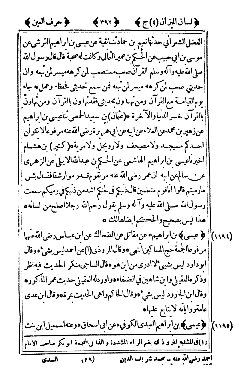 الفضل الشعراني حدثنا نعيم بن حماد ثنا بقية عن عيسى بن إبراهيم القرشي عن موسى بن أبي حبيب عن الحكم بن عمير الثمالي وكانت له صحبة قال قال رسول الله صلى الله عليه وآله وسلم: "القرآن صعب مستصعب لمن كرهه ميسر لمن تبعه وإن حديثي صعب لمن كرهه ميسر لمن تبعه فمن سمع حديثي فحفظه وعمل به جاء يوم القيامة مع القرآن ومن تهاون بحديثي فقد تهاون بالقرآن ومن ومن تهاون بالقرآن خسر الدنيا والآخرة" [عثمان] بن سعيد الحمصي ثنا عيسى بن إبراهيم عن زهير بن محمد عن العلاء عن أبيه عن أبي هريرة رضي الله عنه مرفوعا لا يقولن أحدكم مسيجد ولا مصيحف ولا رويجل ولا مرية [كثير] بن هشام أخبرنا عيسى بن إبراهيم الهاشمي عن الحكم بن عبد الله الإيلي عن الزهري عن سالم عن أبيه أن عمر رضي الله عنه مر بقوم قد رموا رشقا فقال بئس ما رميتم قال أنا قوم متعلمين قال ذنبكم في لحنكم أشد من ذنبكم في رميكم سمعت رسول الله صلى الله عليه وآله وسلم يقول: "رحم الله رجلا أصلح من لسانه هذا" ليس بصحيح والحكم أيضا هالك