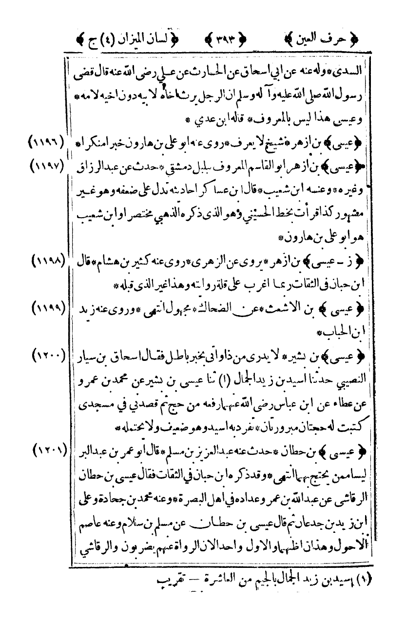 [1201] "عيسى" بن حطان حدث عنه عبد العزيز بن مسلم قال أبو عمر بن عبد البر ليسا ممن يحتج بهما انتهى وقد ذكره ابن حبان في الثقات فقال عيسى بن حطان الرقاشي عن عبد الله بن عمر وعداده في أهل البصرة وعنه محمد بن جحادة وعلي بن زيد بن جدعان ثم قال عيسى بن حطان عن مسلم بن سلام وعنه عاصم الأحول وهذان أظنهما والأول واحدا لأن الرواة عنهم يضربون والرقاشي