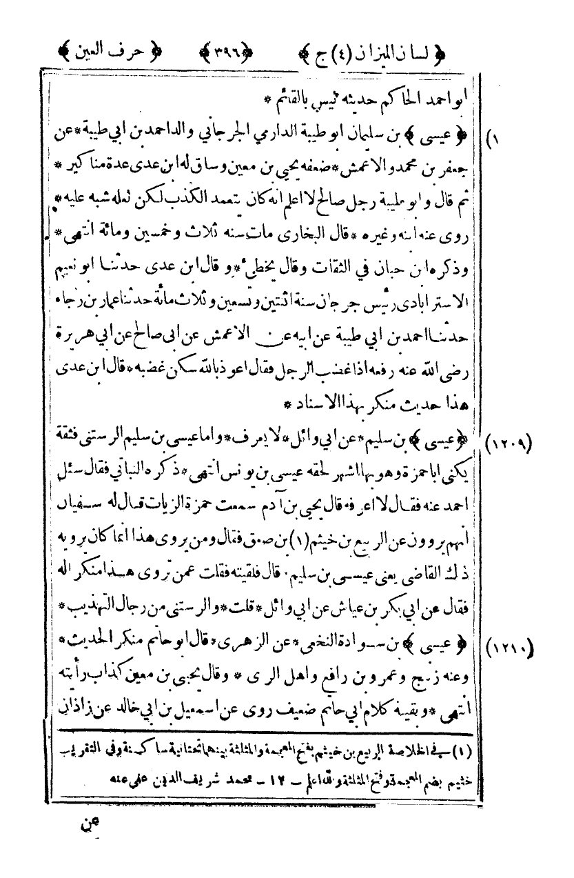 [1209] "عيسى" بن سليم عن أبي وائل لا يعرف وأما عيسى بن سليم الرستني فثقة يكنى أبا حمزة وهو بها أشهر لحقه عيسى بن يونس انتهى وذكره النباتي فقال سئل أحمد عنه فقال لا أعرفه قال يحيى بن آدم سمعت حمزة الزيات قال له سفيان أنهم يروون عن الربيع بن خيثم1 بن صعق فقال ومن يروي هذا إنما كان يرويه ذاك القاضي يعني عيسى بن سليم قال فلقيته فقلت عمن تروي هذا منكرا له فقال عن أبي بكر بن عياش عن أبي وائل قلت والرستني من رجال التهذيب