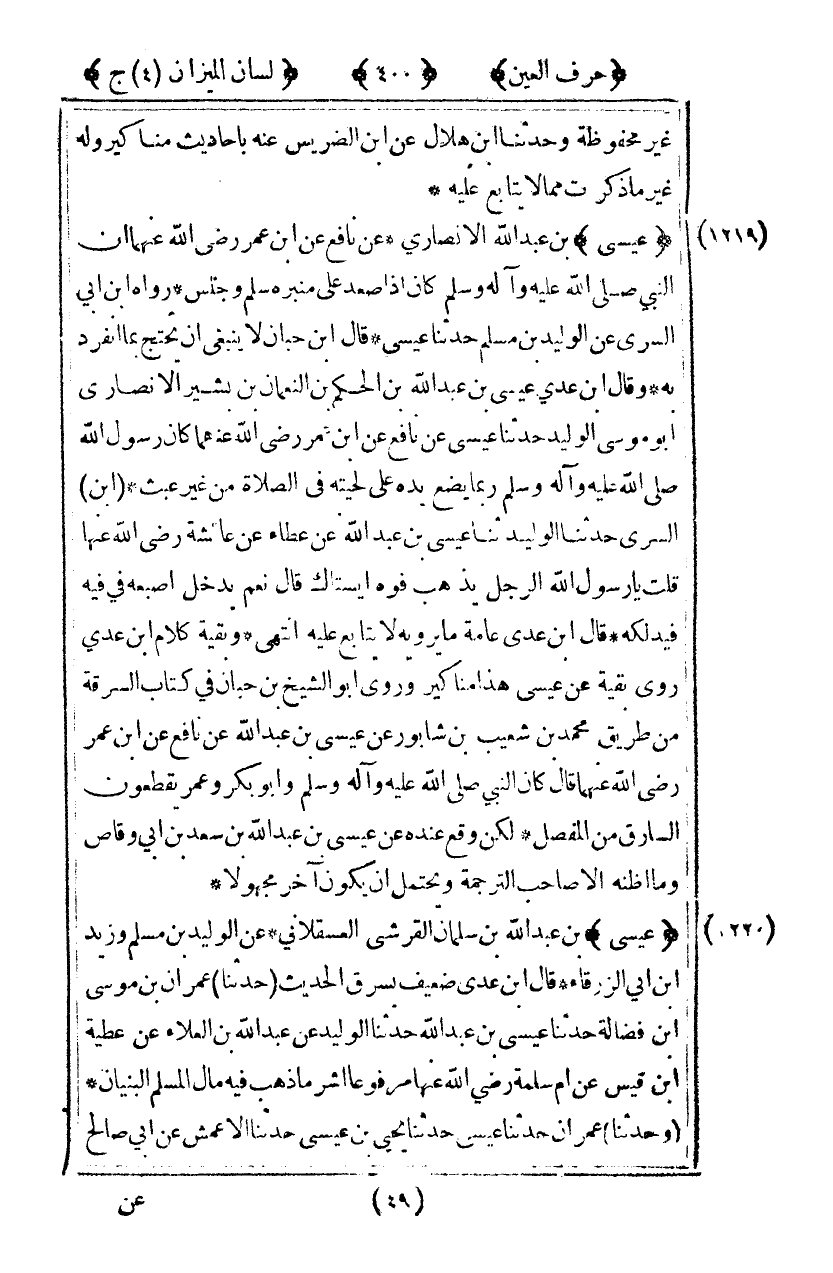 [1219] "عيسى" بن عبد الله الأنصاري عن نافع عن ابن عمر رضي الله عنهما أن النبي صلى الله عليه وآله وسلم كان إذا صعد على منبره سلم وجلس رواه ابن أبي السرى عن الوليد بن مسلم حدثنا عيسى قال ابن حبان لا ينبغي أن يحتج بما انفرد به وقال ابن عدى عيسى بن عبد الله ابن الحكم بن النعمان بن بشير الأنصاري أبوه موسى الوليد حدثنا عيسى عن نافع عن ابن عمر رضي الله عنهما كان رسول الله صلى الله عليه وآله وسلم ربما يضع يده على لحيته في الصلاة من غير عبث [ابن] السرى حدثنا الوليد ثنا عيسى بن عبد الله عن عطاء عن عائشة رضي الله عنها قلت يا رسول الله الرجل يذهب فوه أيستاك قال: "نعم يدخل أصبعه في فيه فيدلكه" قال ابن عدى عامة ما يرويه لا يتابع عليه انتهى وبقية كلام ابن عدى روى بقية عن عيسى هذا مناكير وروى أبو الشيخ بن حبان في كتاب السرقة من طريق محمد بن شعيب بن شابور عن عيسى بن عبد الله عن نافع عن ابن عمر رضي الله عنهما قال كان النبي صلى الله عليه وآله وسلم وأبو بكر وعمر يقطعون السارق من المفصل لكن وقع عنده عن عيسى بن عبد الله ابن سعد بن أبي وقاص وما أظنه إلا صاحب الترجمة ويحتمل أن يكون آخر مجهولا.