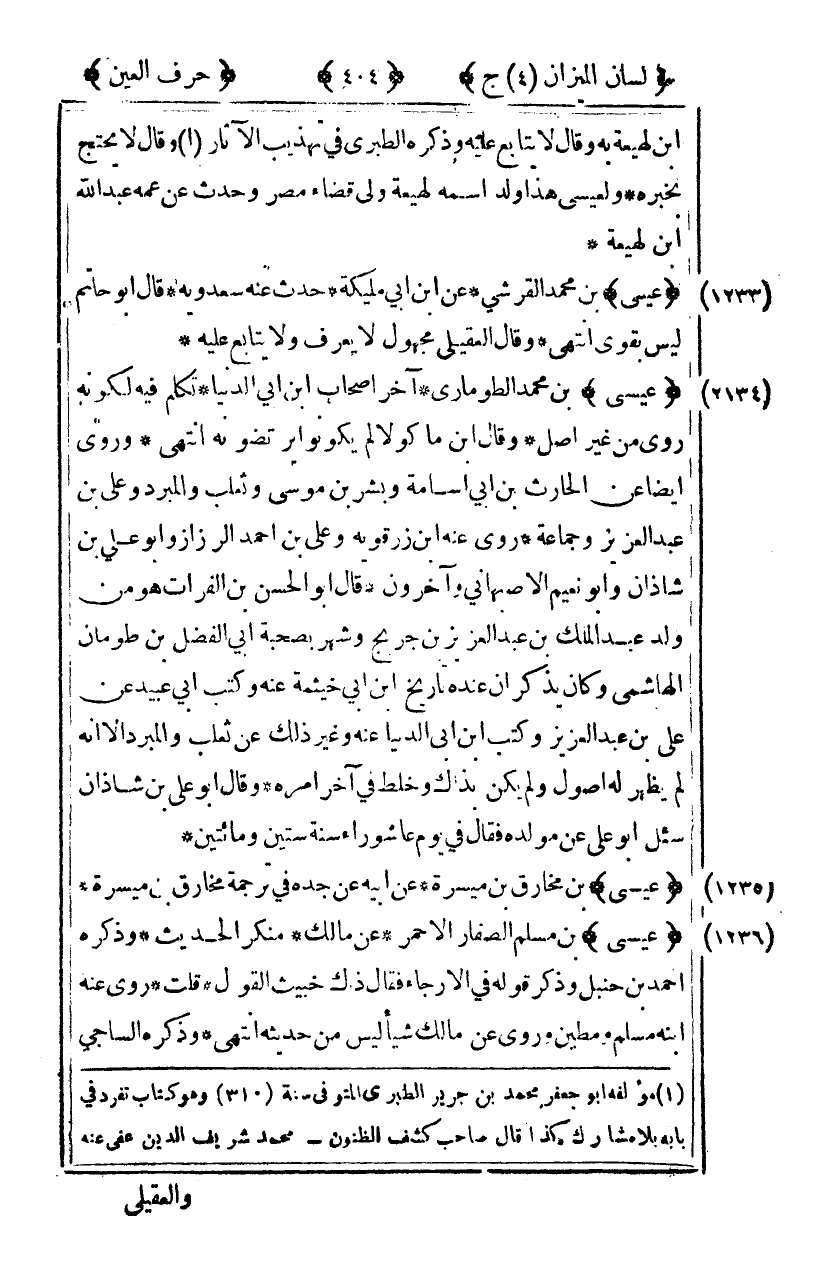 ابن لهيعة وقال لا يتابع عليه وذكره الطبري في تهذيب الآثار1 وقال لا يحتج بخبره ولعيسى هذا ولد اسمه لهيعة ولي قضاء مصر وحدث عن عمه عبد الله ابن لهيعة.