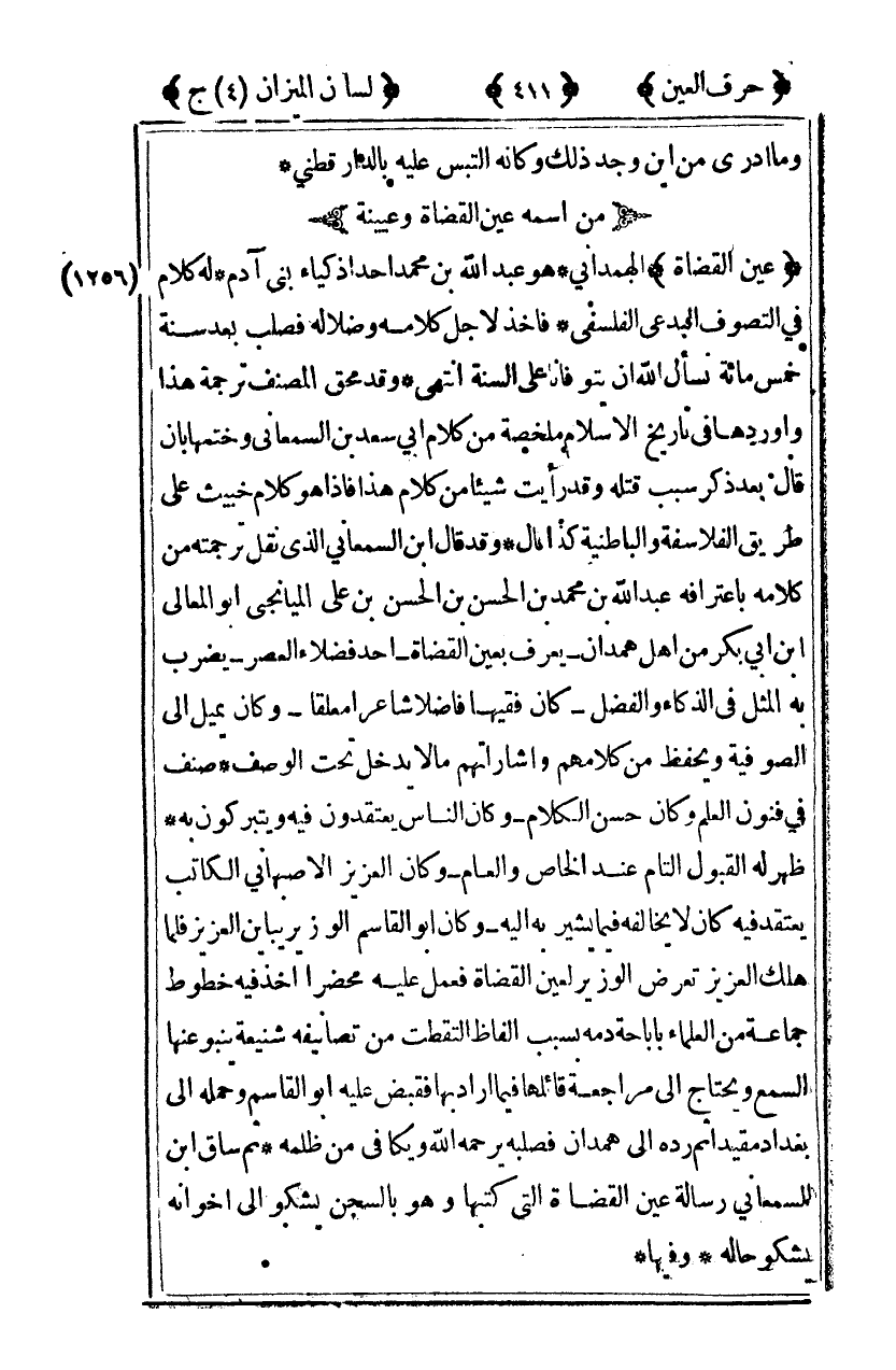 [1256] "عين القضاة" الهمداني هو عبد الله ابن محمد أحد أذكياء بني آدم له كلام في التصوف البدعي الفلسفي فأخذ لأجل كلامه وضلاله فصلب بعد سنة خمس مائة نسأل الله أن يتوفانا على السنة انتهى وقد محق المصنف ترجمة هذا وأوردها في تاريخ الإسلام ملخصة من كلام أبي سعد بن السمعاني وختمها بان قال بعد ذكر سبب قتله وقد رأيت شيئا من كلام هذا فإذا هو كلام خبيث على طريق الفلاسفة والباطنية كذا قال وقد قال ابن السمعاني الذي نقل ترجمته من كلامه باعترافه عبد الله ابن محمد بن الحسن بن الحسن بن علي الميانجي وأبو المعالي بن أبي بكر من أهل همدان يعرف بعين القضاة أحد فضلاء العصر يضرب به المثل في الذكاء والفضل كان فقيها فاضلا شاعرا معلقا وكان يميل إلى الصوفية ويحفظ من كلامهم وإشاراتهم مالا يدخل تحت الوصف صنف في فنون العلم وكان حسن الكلام وكان الناس يعتقدون فيه ويتبركون به ظهر له القبول التام عند الخاص والعام وكان العزيز الأصبهاني الكاتب يعتقد فيه كان لا يخالفه فيما يشير به إليه وكان أبو القاسم الوزير يباين العزيز فلما هلك العزيز تعرض الوزير لعين القضاة فعمل عليه محضرا أخذ فيه خطوط جماعة من العلماء بإباحة دمه بسبب ألفاظ التقطت من تصانيفه شنيعة ينبو عنها السمع ويحتاج إلى مراجعة قائلها فيما أراد بها فقبض عليه أبو القاسم وحمله إلى بغداد مقيدا ثم رده إلى همدان فصلبه يرحمه الله ويكافي من ظلمه ثم ساق ابن السمعاني رسالة عين القضاة التي كتبها وهو بالسجن بشكوى إلى إخوانه يشكو حاله وفيها