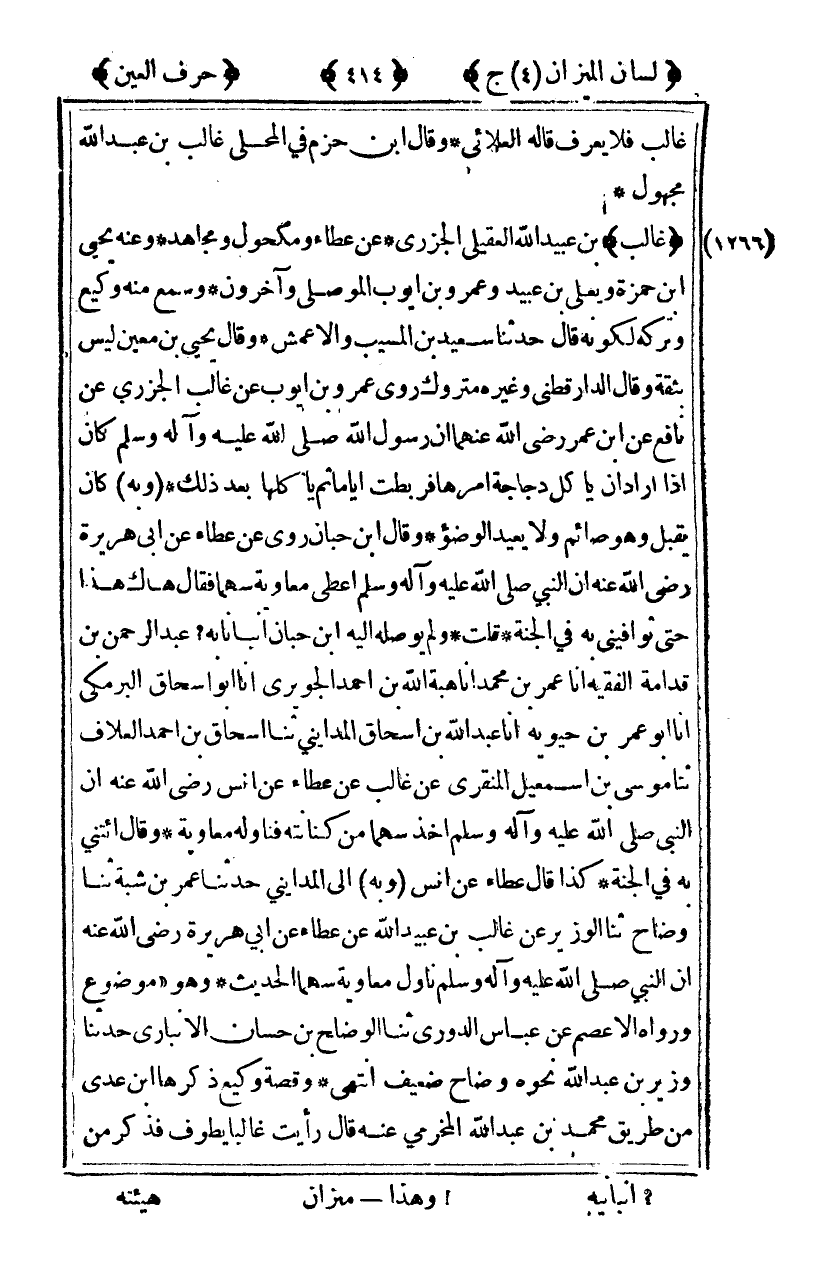 [1266] "غالب" بن عبيد الله العقيلي الجزري عن عطاء ومكحول ومجاهد وعنه يحيى بن حمزة ويعلى بن عبيد وعمرو بن أيوب الموصلي وآخرون وسمع منه وكيع وتركه لكونه قال حدثنا سعيد بن المسيب والأعمش وقال يحيى بن معين ليس بثقة وقال الدارقطني وغيره متروك روى عمرو بن أيوب عن غالب الجزري عن نافع عن ابن عمر رضي الله عنهما أن رسول الله صلى الله عليه وآله وسلم كان إذا أراد أن يأكل دجاجة أمرها فربطت أياما ثم يأكلها بعد ذلك [وبه] كان يقبل وهو صائم ولا يعيد الوضؤ وقال ابن حابن روى عن عطاء عن أبي هريرة رضي الله عنه أن النبي صلى الله عليه وآله وسلم أعطى معاوية سهما فقال: "هاك هذا حتى توافيني به في الجنة" قلت ولم يوصله إليه ابن حبان أنبأنا به1 عبد الرحمن بن قدامة الفقيه أنا عمر بن محمد2 أنا هبة الله ابن أحمد الجويري أنا أبو إسحاق البرمكي أنا أبو عمر بن حيويه أنا عبد الله ابن إسحاق المدايني ثنا إسحاق بن أحمد العلاف ثنا موسى بن إسمعيل المنقري عن غالب عن عطاء عن أنس رضي الله عنه أن النبي صلى الله عليه وآله وسلم أخذ سهما من كنانته فناوله معاوية وقال: "ائتني به في الجنة" كذا قال عطاء عن أنس [وبه] إلى المدايني حدثنا عمر بن شبة ثنا وضاح ثنا الوزير عن غالب بن عبيد الله عن عطاء عن أبي هريرة رضي الله عنه أن النبي صلى الله عليه وآله وسلم ناول معاوية سهما الحديث وهو موضوع ورواه إلاعصم عن عباس الدوري ثنا الوضاح بن حسان الأنباري حدثنا وزير بن عبد الله نحوه وضاح ضعيف انتهى وقصة وكسع ذكرها بن عدي من طريق محمد بن عبد الله المخرمي عنه قال رأيت غالبا يطوف فذكر من