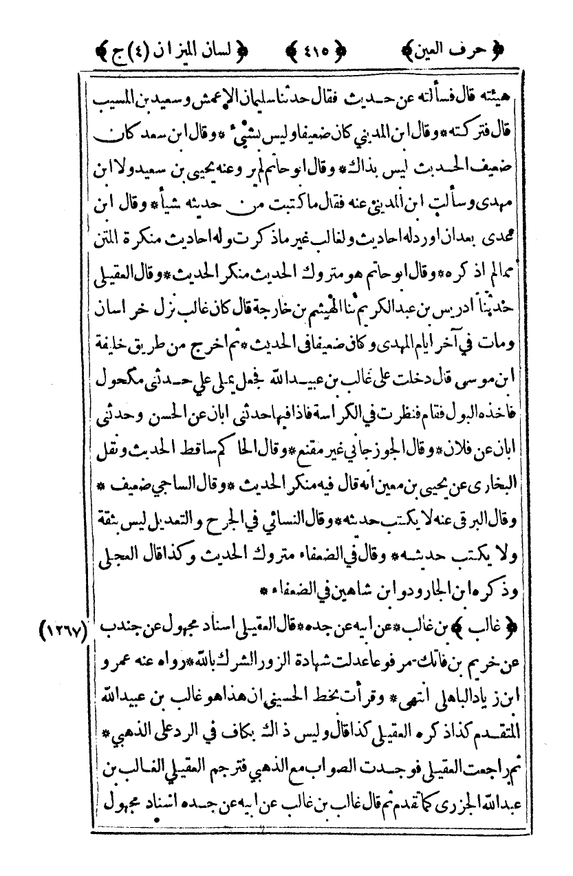 [1267] "غالب" بن غالب عن أبيه عن جده قال العقيلي إسناد مجهول عن جندب عن خريم بن فاتك مرفوعا: "عدلت شهادة الزور الشرك بالله" رواه عنه عمرو بن زياد الباهلي انتهى وقرأت بخط الحسيني أن هذا هو غالب بن عبيد الله المتقدم كذا ذكره العقيلي كذا قال وليس ذاك بكاف في الرد على الذهبي ثم راجعت العقيلي فوجدت الصواب مع الذهبي فترجم العقيلي الغالب بن عبد الله الجزري كما تقدم ثم قال غالب بن غالب عن أبيه عن جده إسناد مجهول