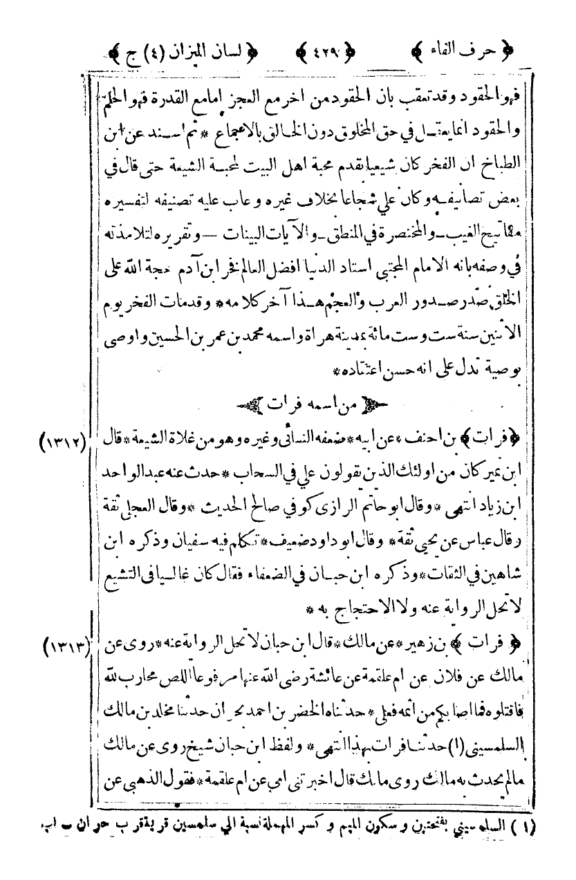[1312] "فرات" بن أحنف عن أبيه ضعفه النسائي وغيره وهو من غلاة الشيعة قال ابن نمير كان من أولئك الذين يقولون علي في السحاب حدث عنه عبد الواحد ابن زياد انتهى وقال أبو حاتم الرازي كوفي صالح الحديث وقال العجلي ثقة وقال عباس عن يحيى ثقة وقال أبو داود ضعيف تكلم فيه سفيان وذكره ابن شاهين في الثقات وذكره ابن حبان في الضعفاء فقال كان غاليا في التشيع لا تحل الرواية عنه ولا الإحتجاج به.