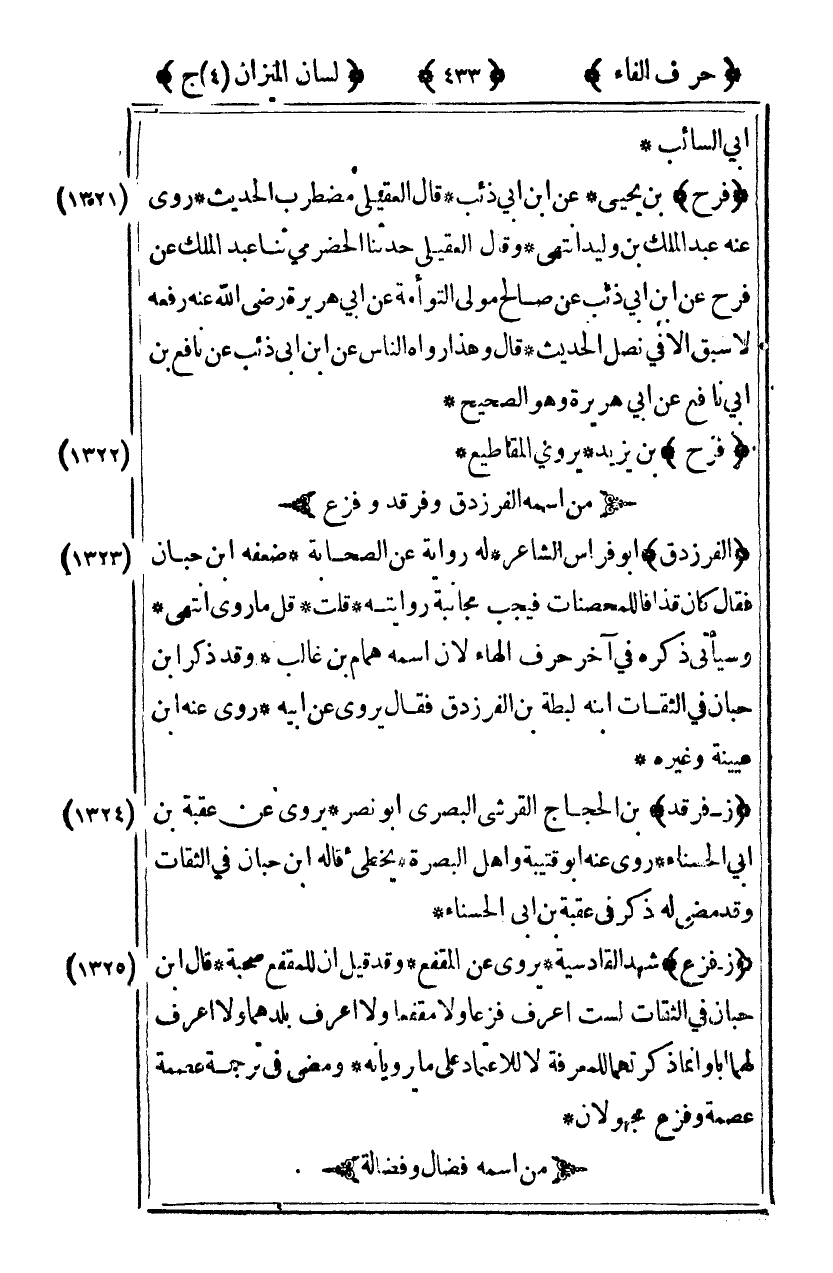 [1323] "الفرزدق" أبو فراس الشاعر له رواية عن الصحابة ضعفه بن حبان فقال كان قذافا للمحصنات فيجب مجانبة روايته قلت قل ما روى انتهى وسيأتى ذكره في آخر حرف الهاء لان اسمه همام بن غالب وقد ذكر بن حبان في الثقات ابنه لبطة بن الفرزدق فقال يروى عن أبيه روى عنه ابن عيينة وغيره.