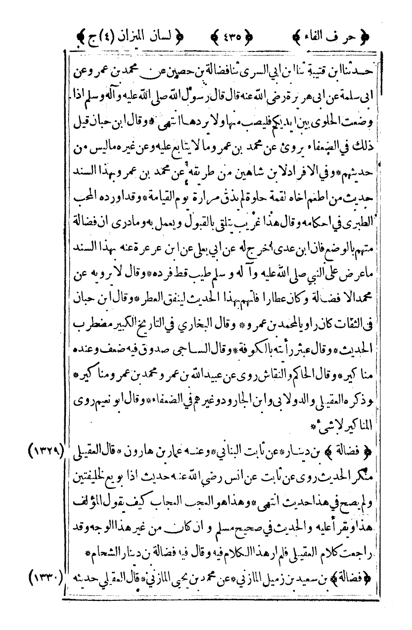 [1329] "فضالة" بن دينار عن ثابت البناني وعنه عمار بن هارون قال العقيلي منكر الحديث روى عن ثابت عن أنس رضي الله عنه حديث إذا بويع لخليقتين ولم يصح في هذا الحديث انتهى وهذا هو العجب العجاب كيف يقول المؤلف هذا ويقرأ عليه والحديث في صحيح مسلم وأن كان من غير هذا الوجه وقد راجعت كلام العقيلي فلم أر هذا الكلام فيه وقال فيه فضالة بن دينار الشحام.