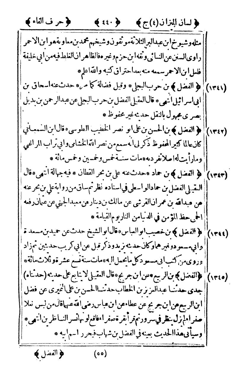 [1341] "الفضل" بن حرب البجلي وقيل فضالة كما مر حدث عنه إسحاق بن أبي إسرائيل انتهى قال العقيلي الفضل بن حرب البجلي عن عبد الرحمن بن بديل بصرى مجهول بالنقل حديثه غير محفوظ.