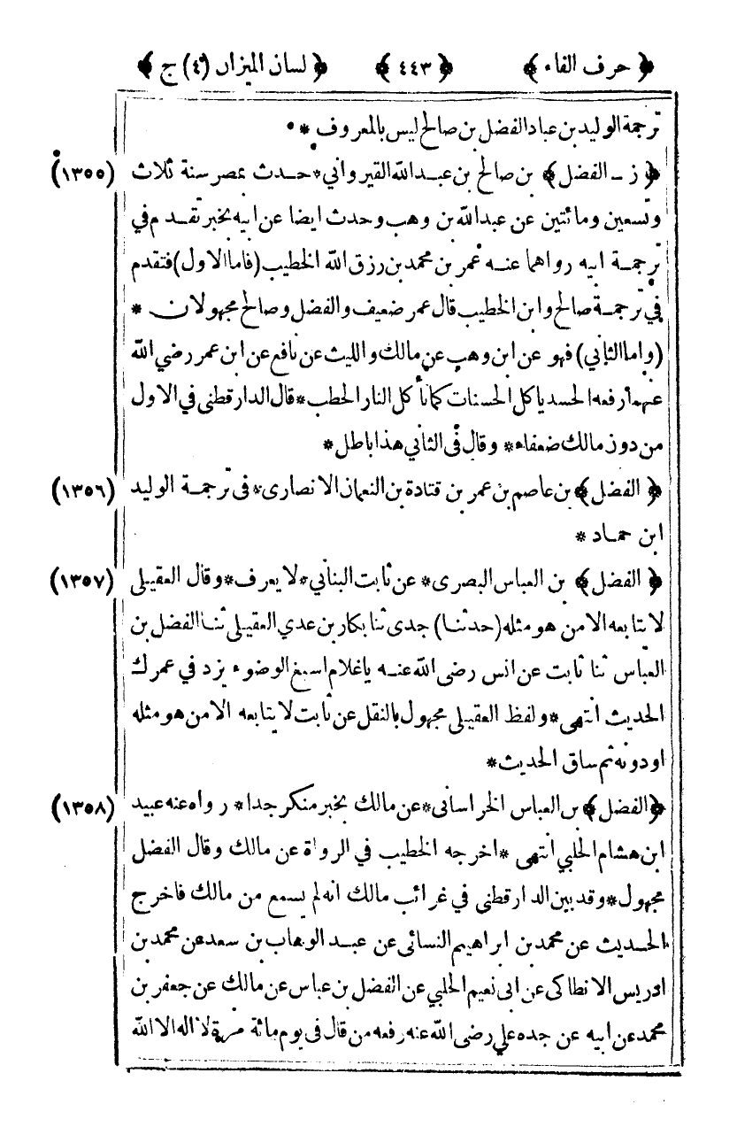 [1357] "الفضل" بن العباس البصري عن ثابت البناني لا يعرف وقال العقيلي لا يتابعه إلا من هو مثله [حدثنا] جدي ثنا بكار بن عدي العقيلي ثنا الفضل بن العباس ثنا ثابت عن أنس رضي الله عنه يا غلام أسبغ الوضوء يزد في عمرك الحديث انتهى ولفظ العقيلي مجهول بالنقل عن ثابت لا يتابعه إلا من هو مثله أو دونه ثم ساق الحديث أو دونه ثم ساق الحديث.