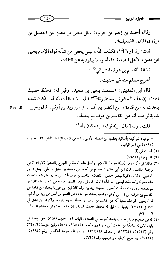 قال ابن المديني: ((سمعت يحيى بن سعيد، وقيل له: تحفظ حديث قتادة، إن هذه الحشوش محتضرة))؟ قال: لا، فقلت أنا له، فكان شعبة يحدث به عن قتادة، عن النضر بن أنس، عن زيد بن أرقم، قال يحيى: شعبة لو علم أنه عن القاسم بن عوف لم يحمله.