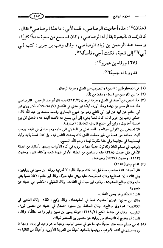 (عفان): هذه أحاديث الرصاصي، قلت لأبي: ما هذا الرصاصي؟ فقال: كان إنسان بالبصرة يقال له الرصاصي، وكان قد سمع من شعبة حديثاً كثيراً، واسمه عبد الرحمن بن زياد الرصاصي، وقال وهب بن جرير: كتب (لي أبي) إلى شعبة، فكنت أجيء فأسأله.