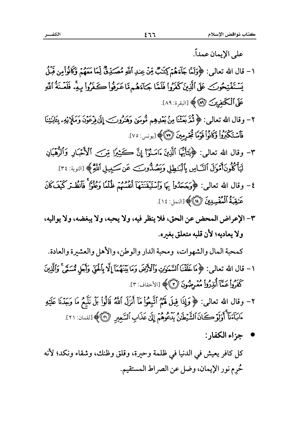 3 - الإعراض المحض عن الحق، فلا ينظر فيه، ولا يحبه، ولا يبغضه، ولا يواليه، ولا يعاديه؛ لأن قلبه متعلق بغيره.