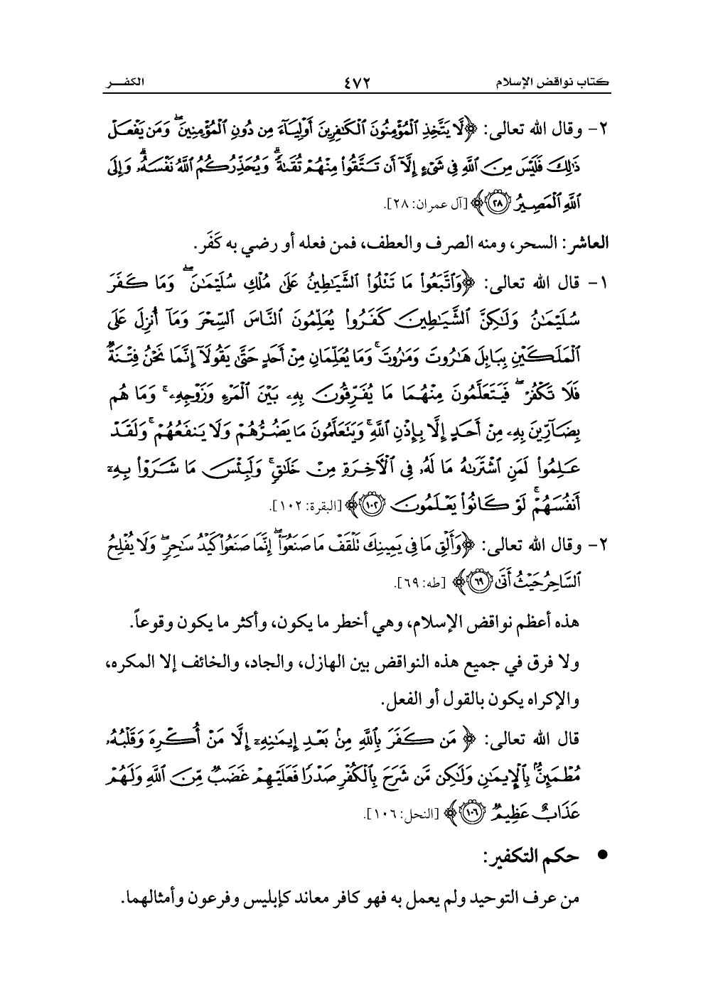 العاشر: السحر، ومنه الصرف والعطف، فمن فعله أو رضي به كَفَر.