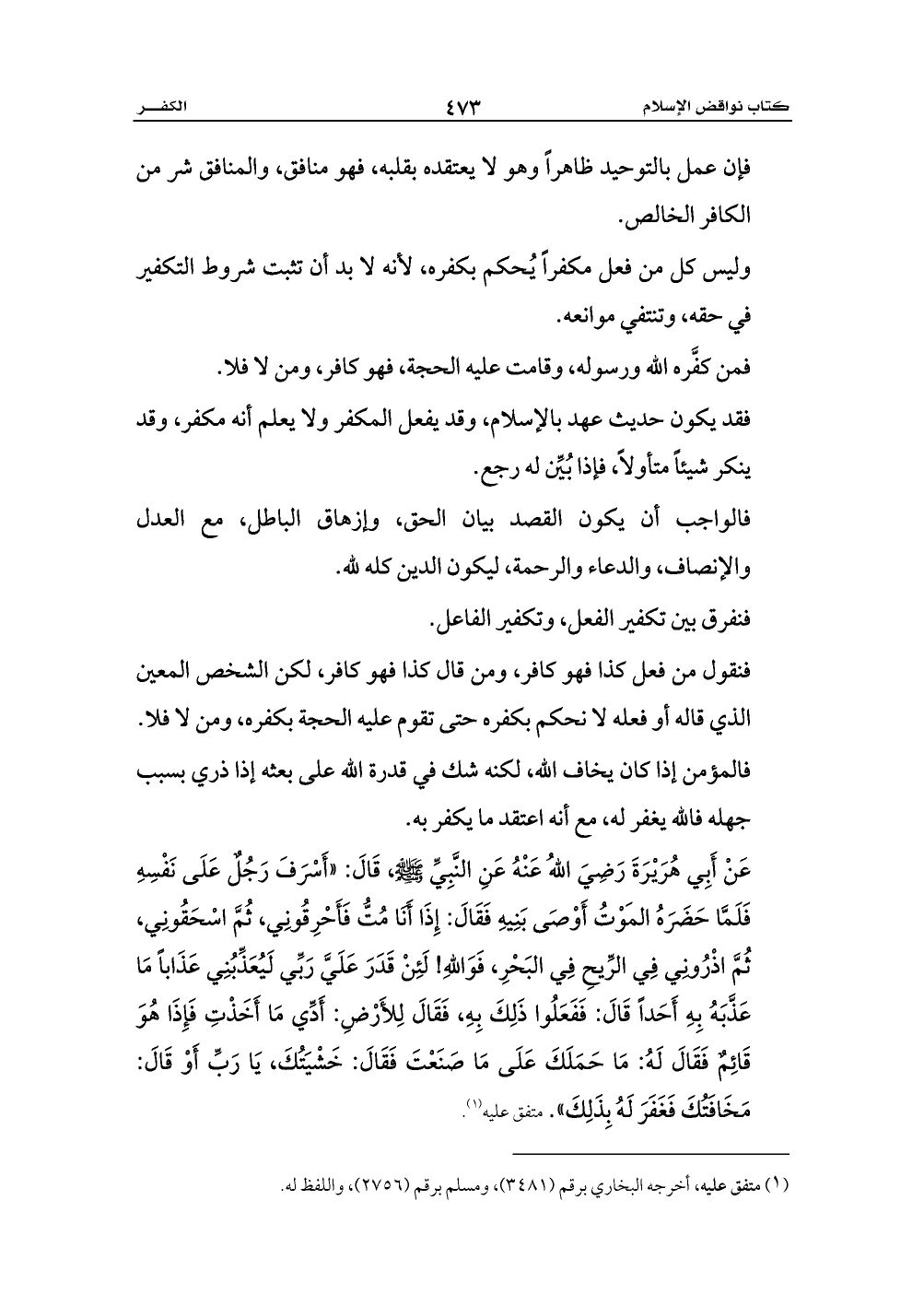 عَنْ أَبِي هُرَيْرَةَ رَضِيَ اللهُ عَنْهُ عَنِ النَّبِيِّ - صلى الله عليه وسلم -، قَالَ: «أَسْرَفَ رَجُلٌ عَلَى نَفْسِهِ فَلَمَّا حَضَرَهُ المَوْتُ أَوْصَى بَنِيهِ فَقَالَ: إِذَا أَنَا مُتُّ فَأَحْرِقُونِي، ثُمَّ اسْحَقُونِي، ثُمَّ اذْرُونِي فِي الرِّيحِ فِي البَحْرِ، فَوَاللهِ! لَئِنْ قَدَرَ عَلَيَّ رَبِّي لَيُعَذِّبُنِي عَذَاباً مَا عَذَّبَهُ بِهِ أَحَداً قَالَ: فَفَعَلُوا ذَلِكَ بِهِ، فَقَالَ لِلأَرْضِ: أَدِّي مَا أَخَذْتِ فَإِذَا هُوَ قَائِمٌ فَقَالَ لَهُ: مَا حَمَلَكَ عَلَى مَا صَنَعْتَ فَقَالَ: خَشْيَتُكَ، يَا رَبِّ أَوْ قَالَ: مَخَافَتُكَ فَغَفَرَ لَهُ بِذَلِكَ». متفق عليه (¬1).