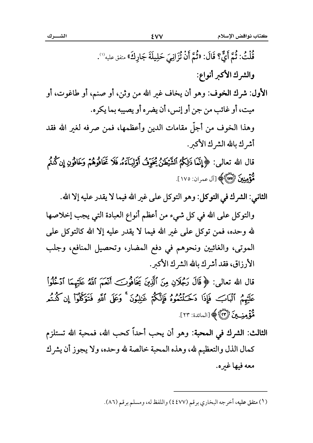 الأول: شرك الخوف: وهو أن يخاف غير الله من وثن، أو صنم، أو طاغوت، أو ميت، أو غائب من جن أو إنس، أن يضره أو يصيبه بما يكره.