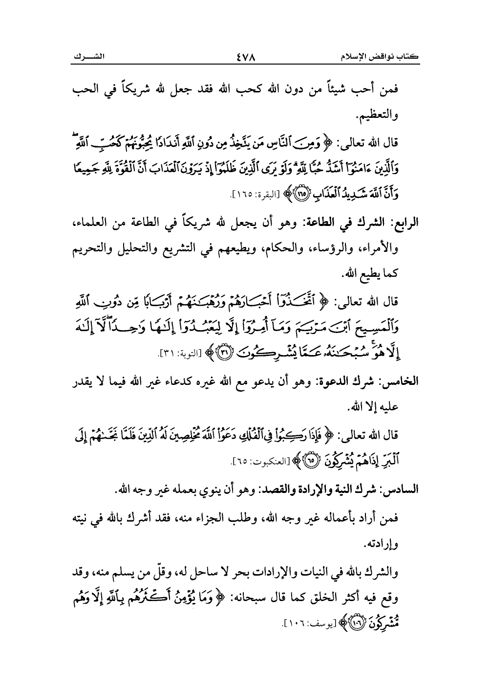 الرابع: الشرك في الطاعة: وهو أن يجعل لله شريكاً في الطاعة من العلماء، والأمراء، والرؤساء، والحكام، ويطيعهم في التشريع والتحليل والتحريم كما يطيع الله.