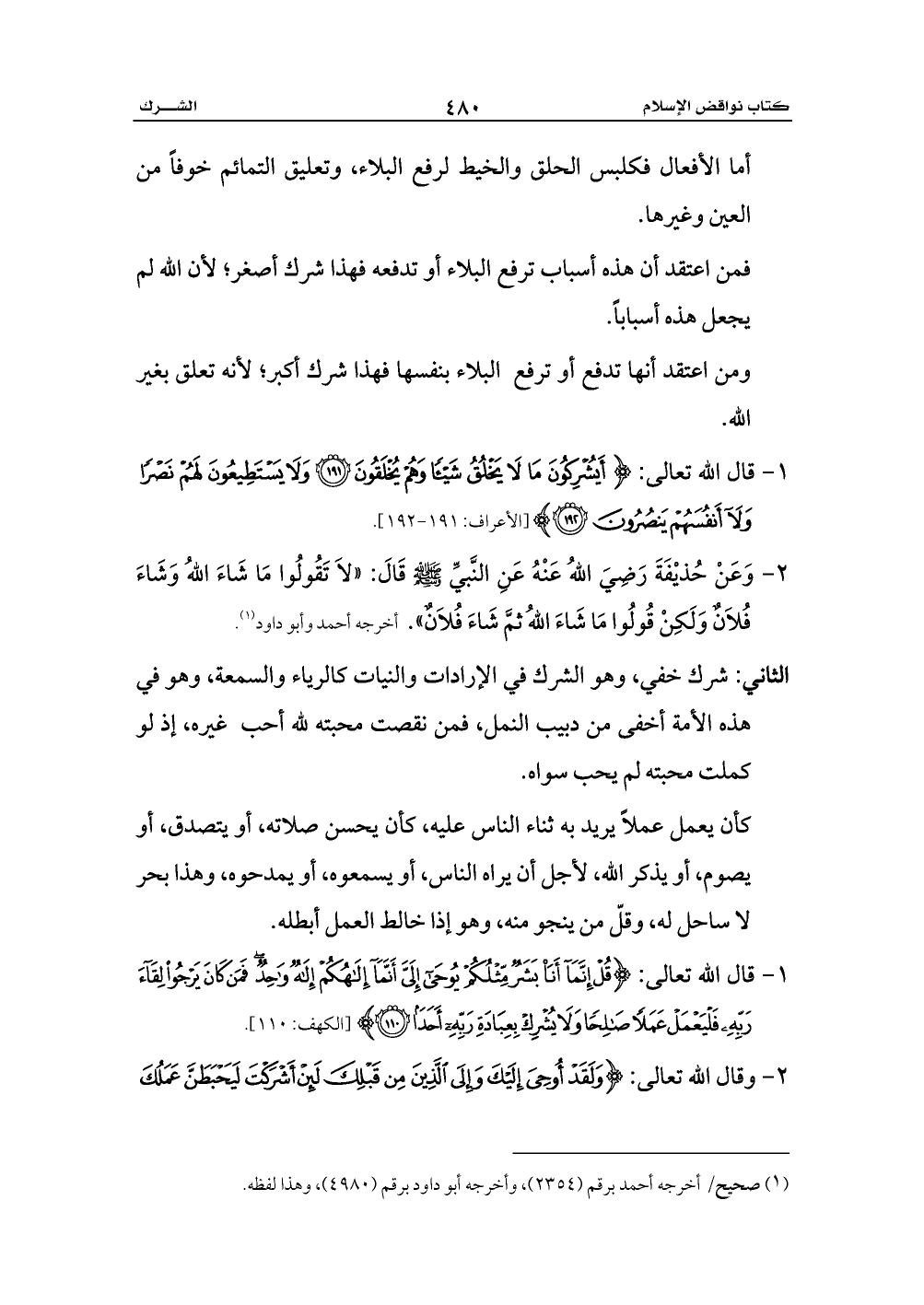 2 - وَعَنْ حُذيْفَةَ رَضِيَ اللهُ عَنْهُ عَنِ النَّبيِّ - صلى الله عليه وسلم - قَالَ: «لاَ تَقُولُوا مَا شَاءَ اللهُ وَشَاءَ فُلاَنٌ وَلَكِنْ قُولُوا مَا شَاءَ اللهُ ثمَّ شَاءَ فُلاَنٌ». أخرجه أحمد وأبو داود (¬1).