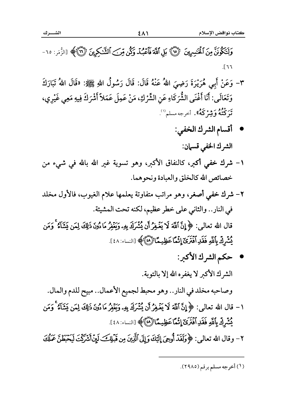 وصاحبه مخلد في النار .. وهو محبط لجميع الأعمال .. مبيح للدم والمال.