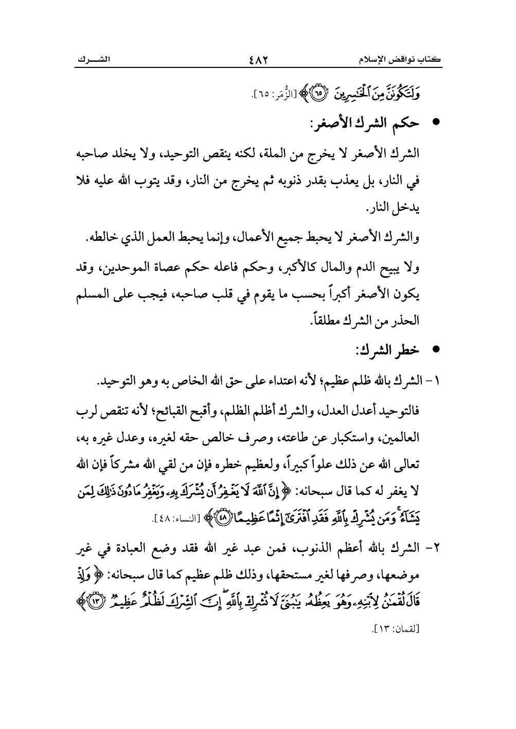 1 - الشرك بالله ظلم عظيم؛ لأنه اعتداء على حق الله الخاص به وهو التوحيد.