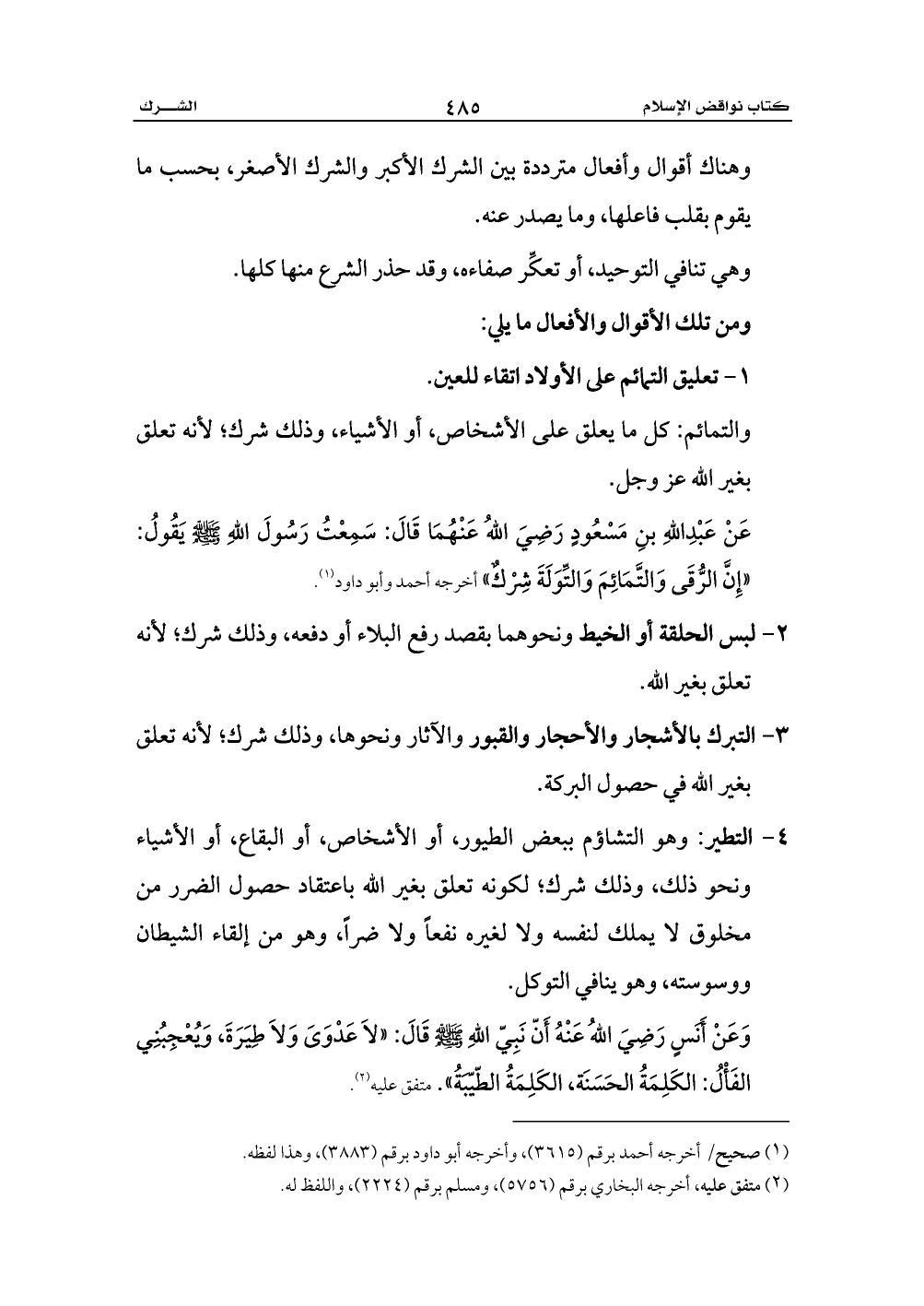 عَنْ عَبْدِاللهِ بنِ مَسْعُودٍ رَضِيَ اللهُ عَنْهُمَا قَالَ: سَمِعْتُ رَسُولَ اللهِ - صلى الله عليه وسلم - يَقُولُ: «إِنَّ الرُّقَى وَالتَّمَائِمَ وَالتِّوَلَةَ شِرْكٌ» أخرجه أحمد وأبو داود (¬1).