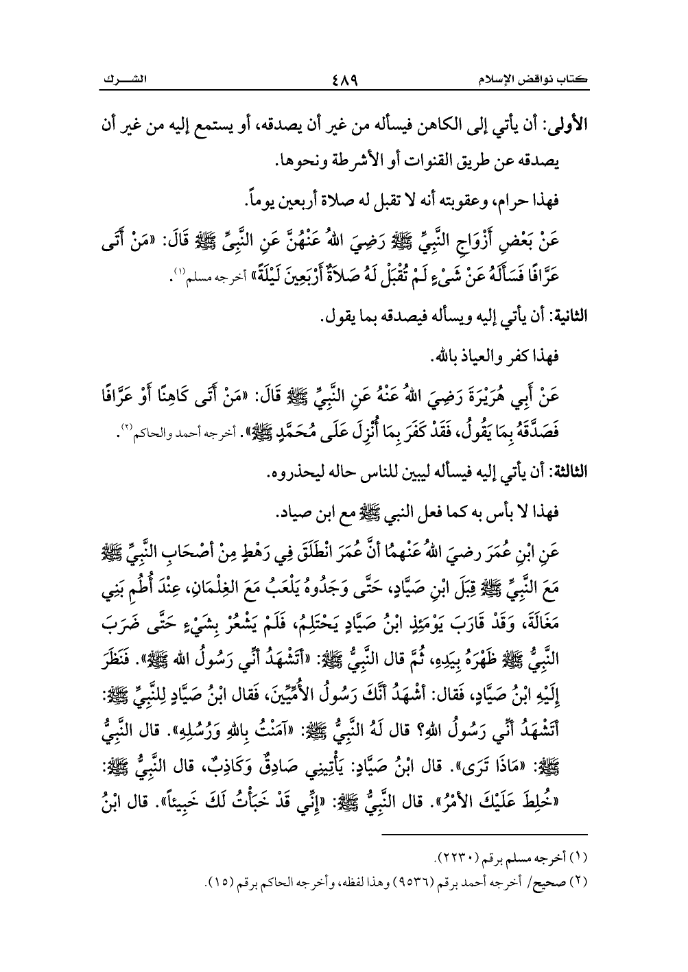 الأولى: أن يأتي إلى الكاهن فيسأله من غير أن يصدقه، أو يستمع إليه من غير أن يصدقه عن طريق القنوات أو الأشرطة ونحوها.