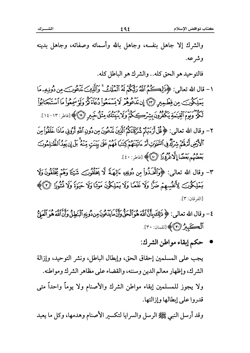 يجب على المسلمين إحقاق الحق، وإبطال الباطل، ونشر التوحيد، وإزالة الشرك، وإظهار معالم الدين وسننه، والقضاء على مظاهر الشرك ومواطنه.