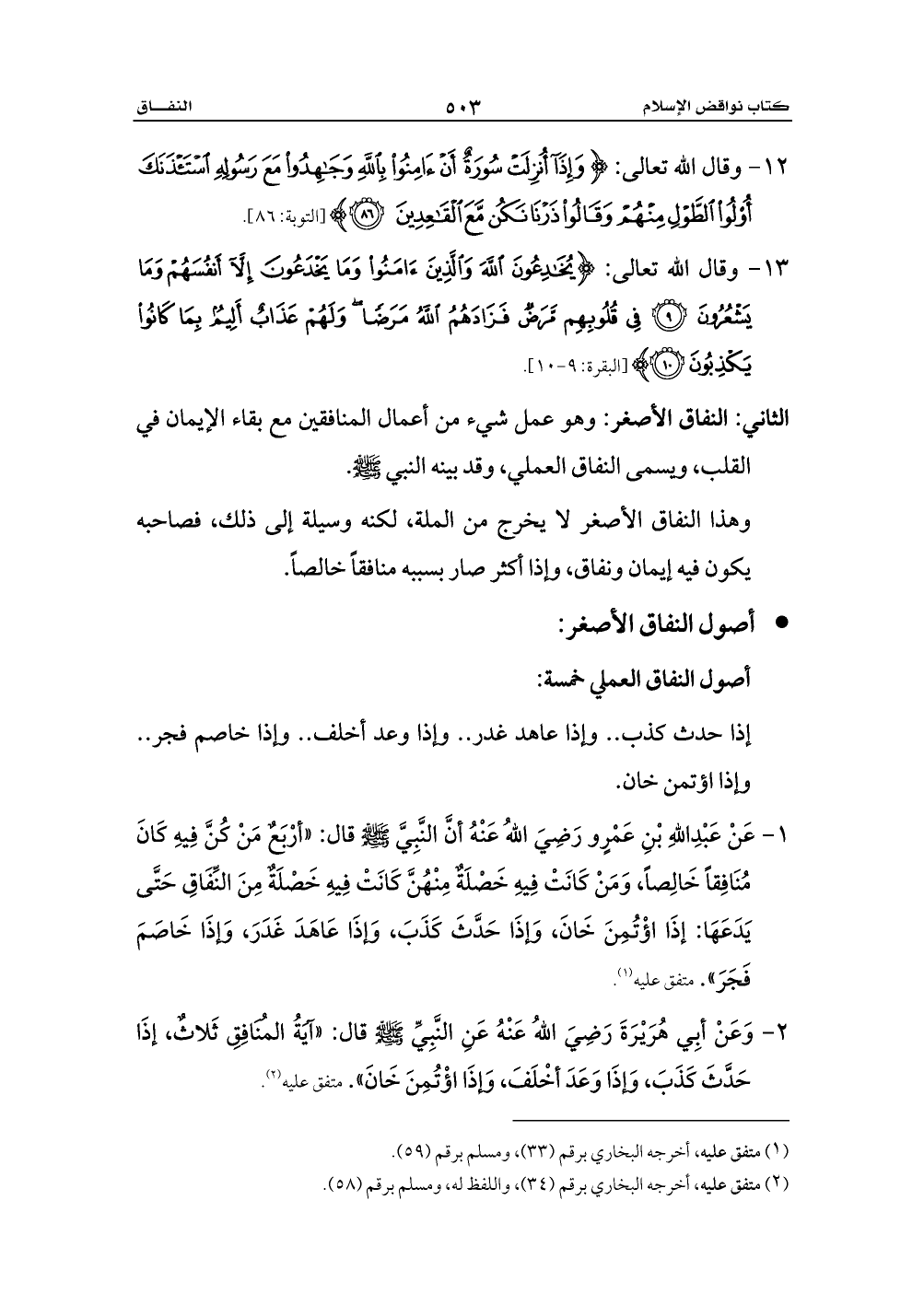 1 - عَنْ عَبْدِاللهِ بْنِ عَمْرٍو رَضِيَ اللهُ عَنْهُ أنَّ النَّبِيَّ - صلى الله عليه وسلم - قال: «أرْبَعٌ مَنْ كُنَّ فِيهِ كَانَ مُنَافِقاً خَالِصاً، وَمَنْ كَانَتْ فِيهِ خَصْلَةٌ مِنْهُنَّ كَانَتْ فِيهِ خَصْلَةٌ مِنَ النِّفَاقِ حَتَّى يَدَعَهَا: إذَا اؤْتُمِنَ خَانَ، وَإذَا حَدَّثَ كَذَبَ، وَإذَا عَاهَدَ غَدَرَ، وَإذَا خَاصَمَ فَجَرَ». متفق عليه (¬1).