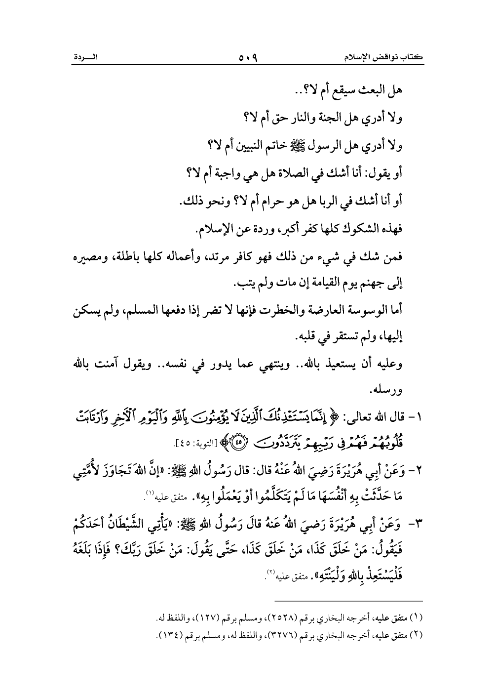 فهذه الشكوك كلها كفر أكبر، وردة عن الإسلام.
