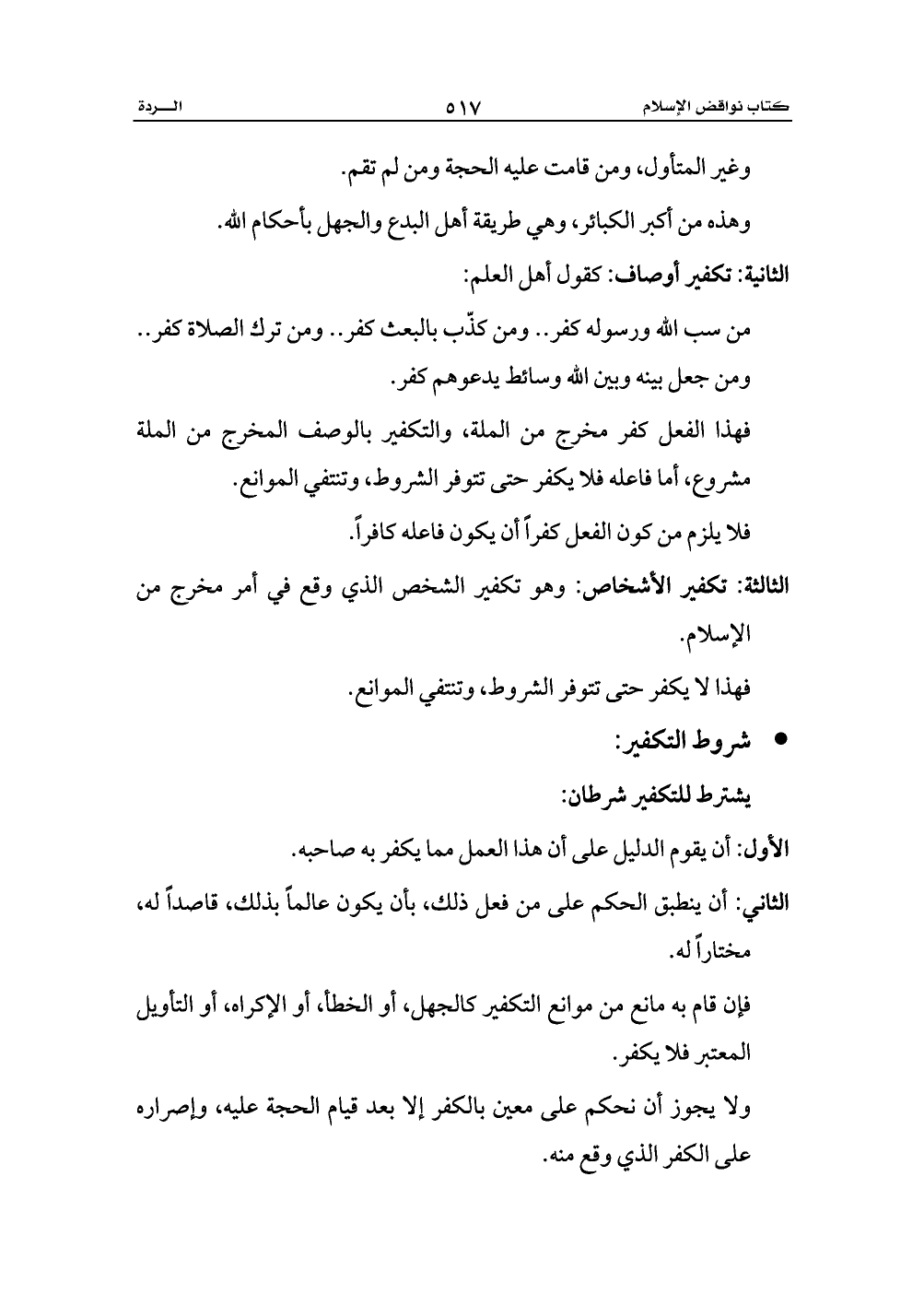 من سب الله ورسوله كفر .. ومن كذّب بالبعث كفر .. ومن ترك الصلاة كفر .. ومن جعل بينه وبين الله وسائط يدعوهم كفر.