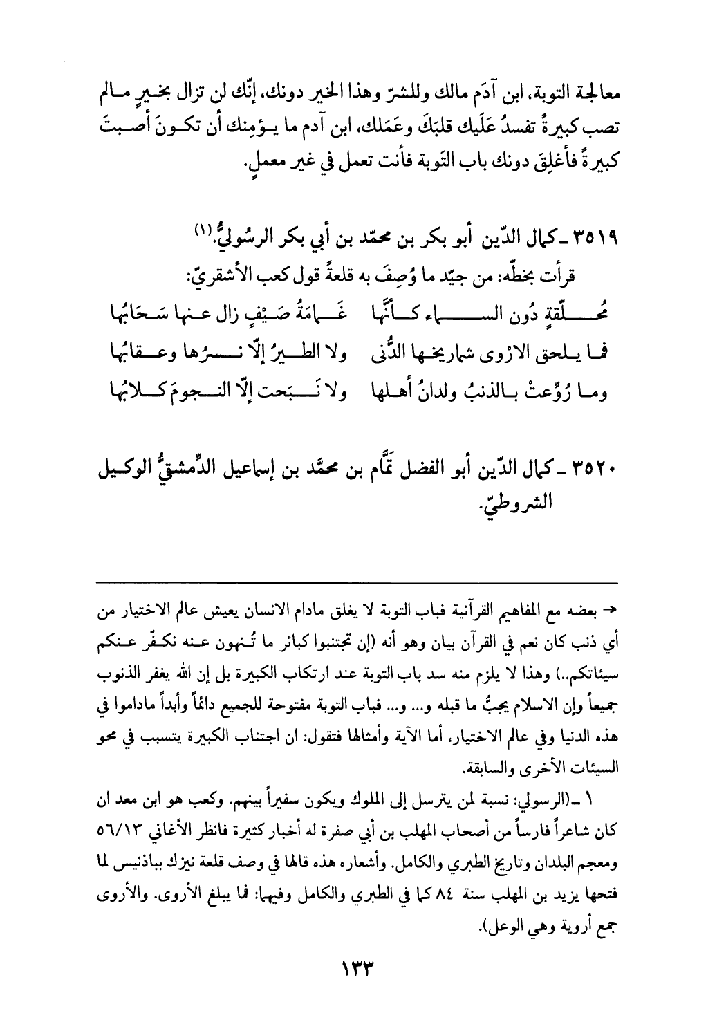 (¬1) (الرسولي: نسبة لمن يترسل إلى الملوك ويكون سفيرا بينهم. وكعب هو ابن معد ان كان شاعرا فارسا من أصحاب المهلب بن أبي صفرة له أخبار كثيرة فانظر الأغاني 56/ 13 ومعجم البلدان وتاريخ الطبري والكامل. وأشعاره هذه قالها في وصف قلعة نيزك بباذنيس لما فتحها يزيد بن المهلب سنة 84 كما في الطبري والكامل وفيهما: فما يبلغ الأروى. والأروى جمع أروية وهي الوعل).