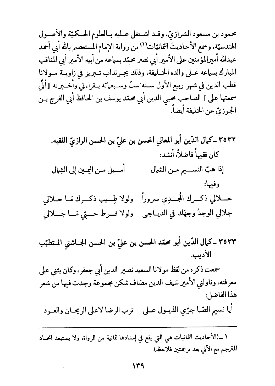 محمود بن مسعود الشرازيّ، وقد اشتغل عليه بالعلوم الحكميّة والأصول الهندسيّة، وسمع الأحاديث الثمانيّات (¬1) من رواية الإمام المستعصم بالله أبي أحمد عبد الله أمير المؤمنين على الأمير أبي نصر محمّد بسماعه من أبيه الأمير أبي المناقب المبارك بسماعه على والده الخليفة، وذلك بجرنداب تبريز في زاوية مولانا قطب الدين في شهر ربيع الأول سنة ستّ وسبعمائة بقراءتي وأخبرته [أنّي سمعتها على] الصاحب محيي الدين أبي محمّد يوسف بن الحافظ أبي الفرج بن الجوزيّ عن الخليفة أيضا.