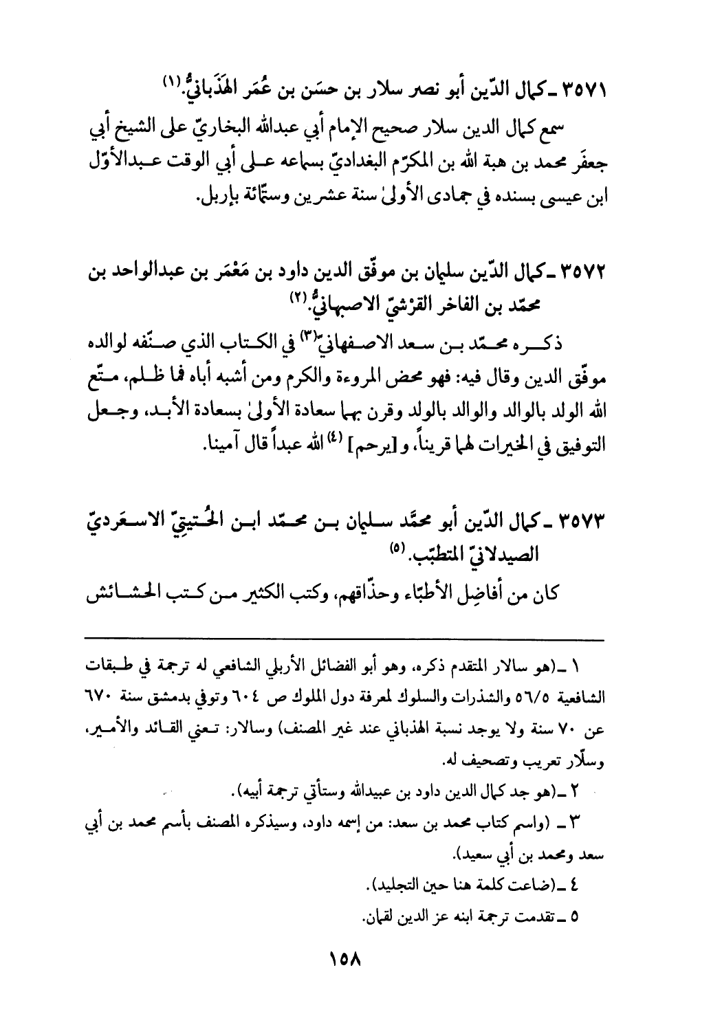 (¬1) (هو سالار المتقدم ذكره، وهو أبو الفضائل الأربلي الشافعي له ترجمة في طبقات الشافعية 56/ 5 والشذرات والسلوك لمعرفة دول الملوك ص 604 وتوفي بدمشق سنة 670 عن 70 سنة ولا يوجد نسبة الهذباني عند غير المصنف) وسالار: تعني القائد والأمير، وسلاّر تعريب وتصحيف له.