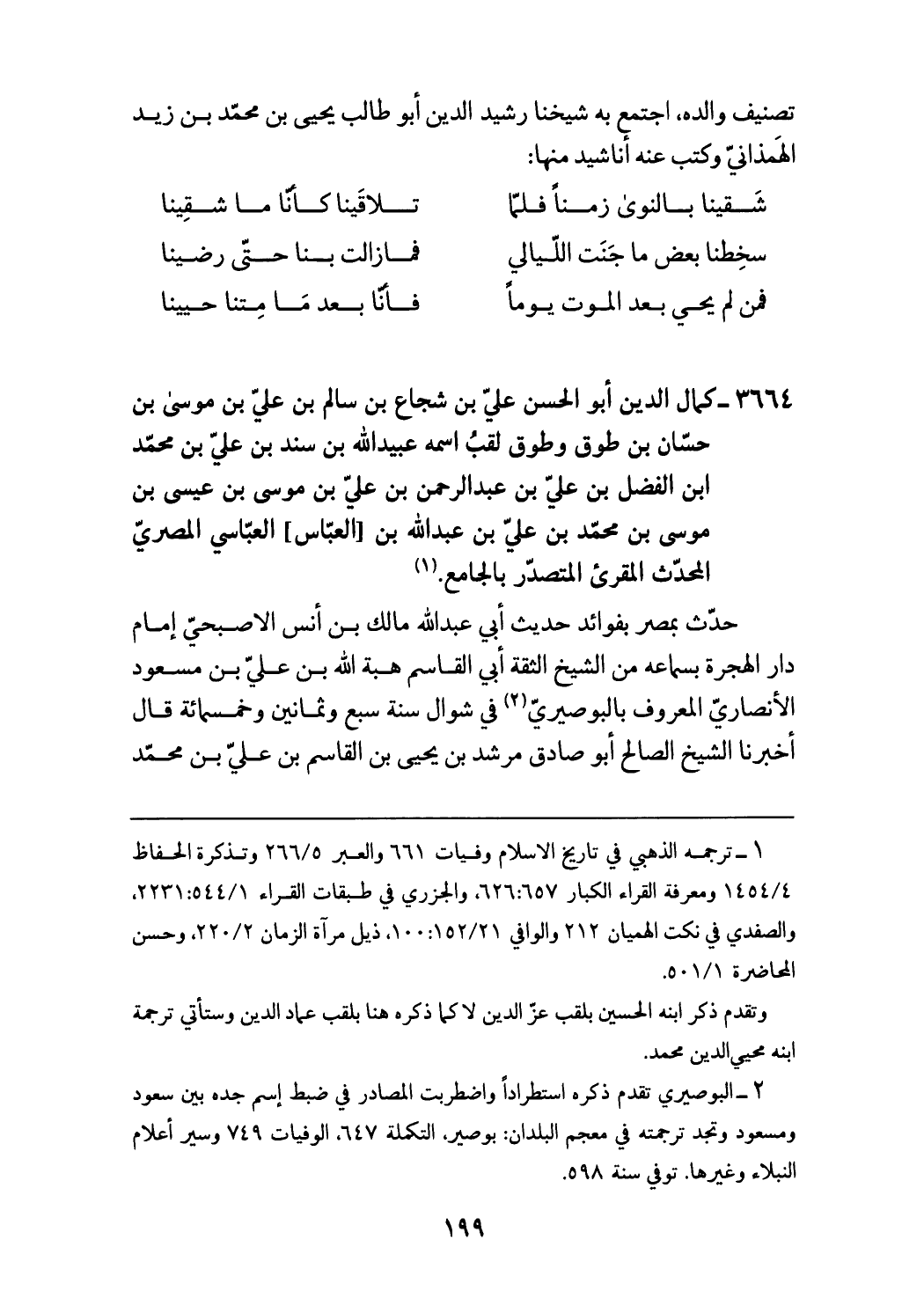 (¬2) البوصيري تقدم ذكره استطرادا واضطربت المصادر في ضبط اسم جده بين سعود ومسعود وتجد ترجمته في معجم البلدان: بوصير، التكملة 647، الوفيات 749 وسير أعلام النبلاء وغيرها. توفي سنة 598.