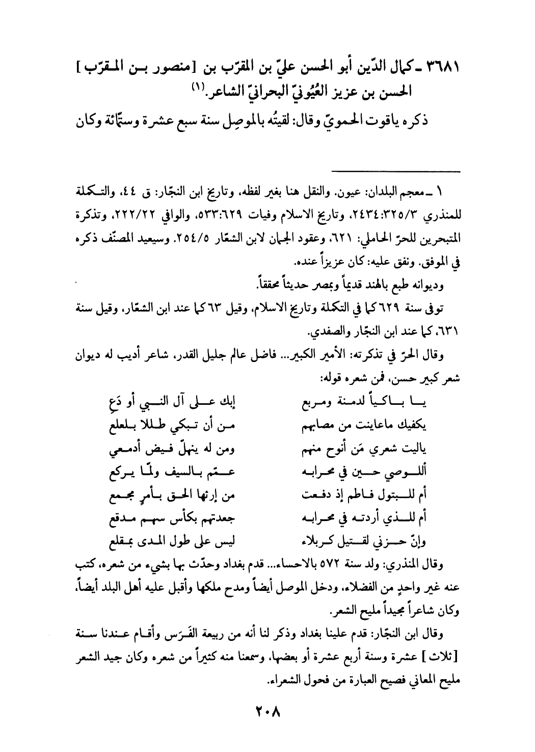 (¬1) معجم البلدان: عيون. والنقل هنا بغير لفظه، وتاريخ ابن النجّار: ق 44، والتكملة للمنذري 325/ 3: 2434، وتاريخ الاسلام وفيات 629: 533، والوافي 222/ 22، وتذكرة المتبحرين للحرّ الحاملي: 621، وعقود الجمان لابن الشعّار 254/ 5.وسيعيد المصنّف ذكره في الموفق. ونفق عليه: كان عزيزا عنده. وديوانه طبع بالهند قديما وبمصر حديثا محققا. توفى سنة 629 كما في التكملة وتاريخ الاسلام، وقيل 63 كما عند ابن الشعّار، وقيل سنة 631، كما عند ابن النجّار والصفدي. وقال الحرّ في تذكرته: الأمير الكبير ... فاضل عالم جليل القدر، شاعر أديب له ديوان شعر كبير حسن، فمن شعره قوله: