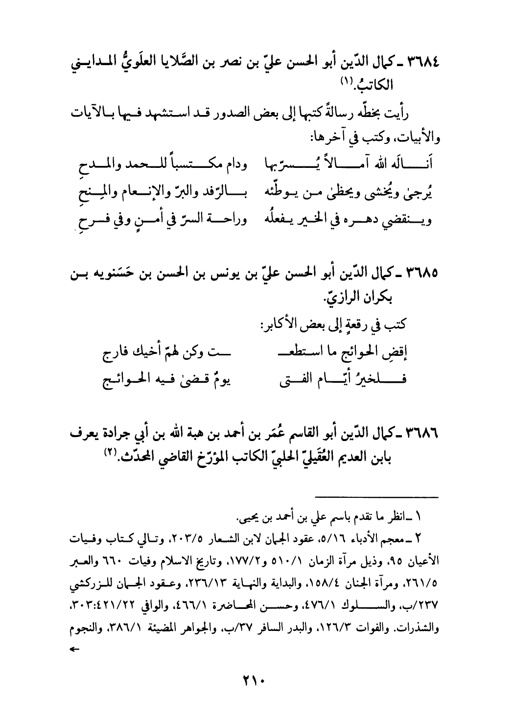 (¬2) معجم الأدباء 5/ 16، عقود الجمان لابن الشعار 203/ 5، وتالي كتاب وفيات الأعيان 95، وذيل مرآة الزمان 510/ 1 و 177/ 2، وتاريخ الاسلام وفيات 660 والعبر 261/ 5، ومرآة الجنان 158/ 4، والبداية والنهاية 236/ 13، وعقود الجمان للزركشي /237 ب، والسلوك 476/ 1، وحسن المحاضرة 466/ 1، والوافي 421/ 22: 303، والشذرات. والفوات 126/ 3، والبدر السافر /37 ب، والجواهر المضيئة 386/ 1، والنجوم -