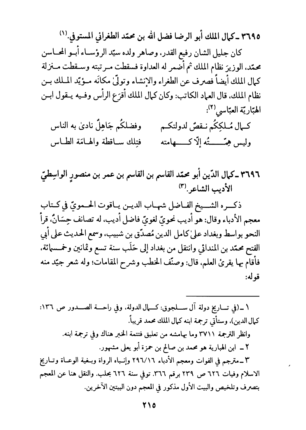 3695 - كمال الملك أبو الرضا فضل الله بن محمّد الطغرائي المستوفي. (¬1)