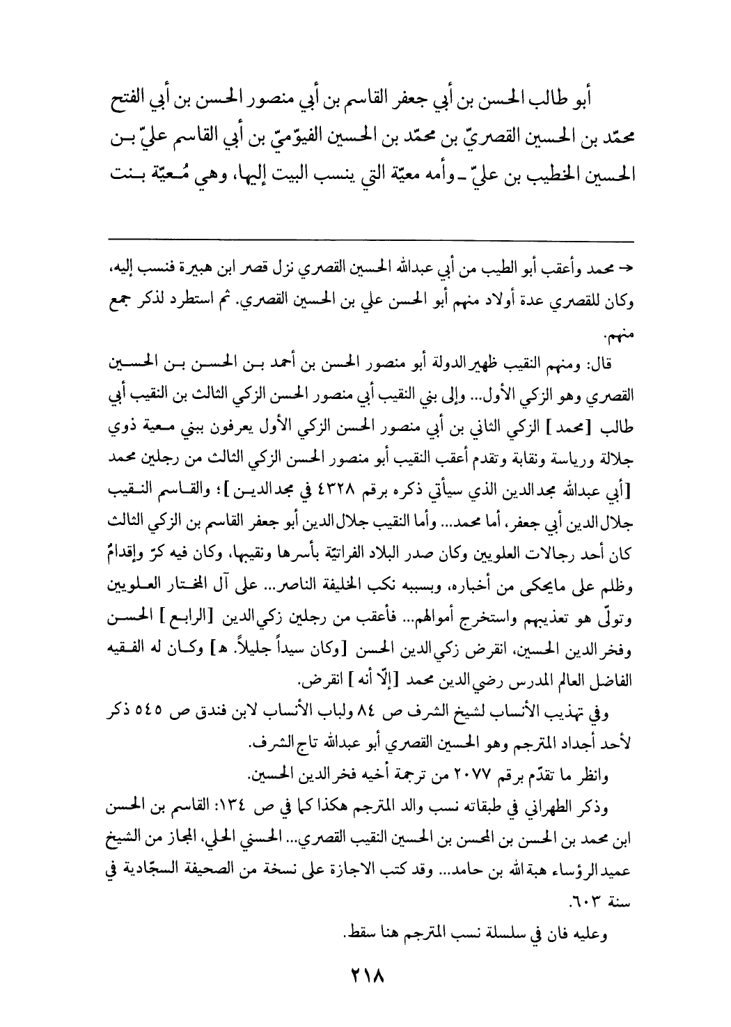 - محمد وأعقب أبو الطيب من أبي عبد الله الحسين القصري نزل قصر ابن هبيرة فنسب إليه، وكان للقصري عدة أولاد منهم أبو الحسن علي بن الحسين القصري. ثم استطرد لذكر جمع منهم. قال: ومنهم النقيب ظهير الدولة أبو منصور الحسن بن أحمد بن الحسن بن الحسين القصري وهو الزكي الأول ... وإلى بني النقيب أبي منصور الحسن الزكي الثالث بن النقيب أبي طالب [محمد] الزكي الثاني بن أبي منصور الحسن الزكي الأول يعرفون ببني معية ذوي جلالة ورياسة ونقابة وتقدم أعقب النقيب أبو منصور الحسن الزكي الثالث من رجلين محمد [أبي عبد الله مجد الدين الذي سيأتي ذكره برقم 4328 في مجد الدين]؛ والقاسم النقيب جلال الدين أبي جعفر، أما محمد ... وأما النقيب جلال الدين أبو جعفر القاسم بن الزكي الثالث كان أحد رجالات العلويين وكان صدر البلاد الفراتيّة بأسرها ونقيبها، وكان فيه كرّ وإقدام وظلم على ما يحكى من أخباره، وبسببه نكب الخليفة الناصر ... على آل المختار العلويين وتولّى هو تعذيبهم واستخرج أموالهم ... فأعقب من رجلين زكي الدين [الرابع] الحسن وفخر الدين الحسين، انقرض زكي الدين الحسن [وكان سيدا جليلا. هـ] وكان له الفقيه الفاضل العالم المدرس رضي الدين محمد [إلاّ أنه] انقرض. وفي تهذيب الأنساب لشيخ الشرف ص 84 ولباب الأنساب لابن فندق ص 545 ذكر لأحد أجداد المترجم وهو الحسين القصري أبو عبد الله تاج الشرف. وانظر ما تقدّم برقم 2077 من ترجمة أخيه فخر الدين الحسين. وذكر الطهراني في طبقاته نسب والد المترجم هكذا كما في ص 134: القاسم بن الحسن ابن محمد بن الحسن بن المحسن بن الحسين النقيب القصري ... الحسني الحلي، المجاز من الشيخ عميد الرؤساء هبة الله بن حامد ... وقد كتب الاجازة على نسخة من الصحيفة السجّادية في سنة 603. وعليه فان في سلسلة نسب المترجم هنا سقط.