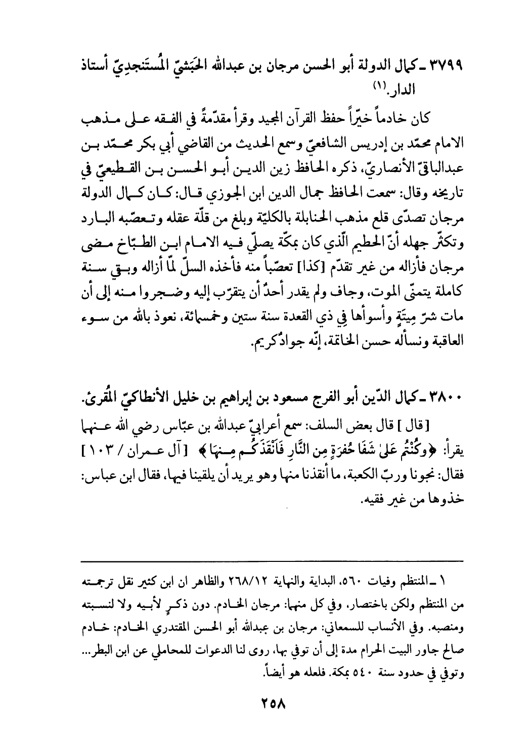 (¬1) المنتظم وفيات 560، البداية والنهاية 268/ 12 والظاهر ان ابن كثير نقل ترجمته من المنتظم ولكن باختصار، وفي كل منهما: مرجان الخادم. دون ذكر لأبيه ولا لنسبته ومنصبه. وفي الأنساب للسمعاني: مرجان بن عبد الله أبو الحسن المقتدري الخادم: خادم صالح جاور البيت الحرام مدة إلى أن توفي بها، روى لنا الدعوات للمحاملي عن ابن البطر ... وتوفي في حدود سنة 540 بمكة. فلعله هو أيضا.