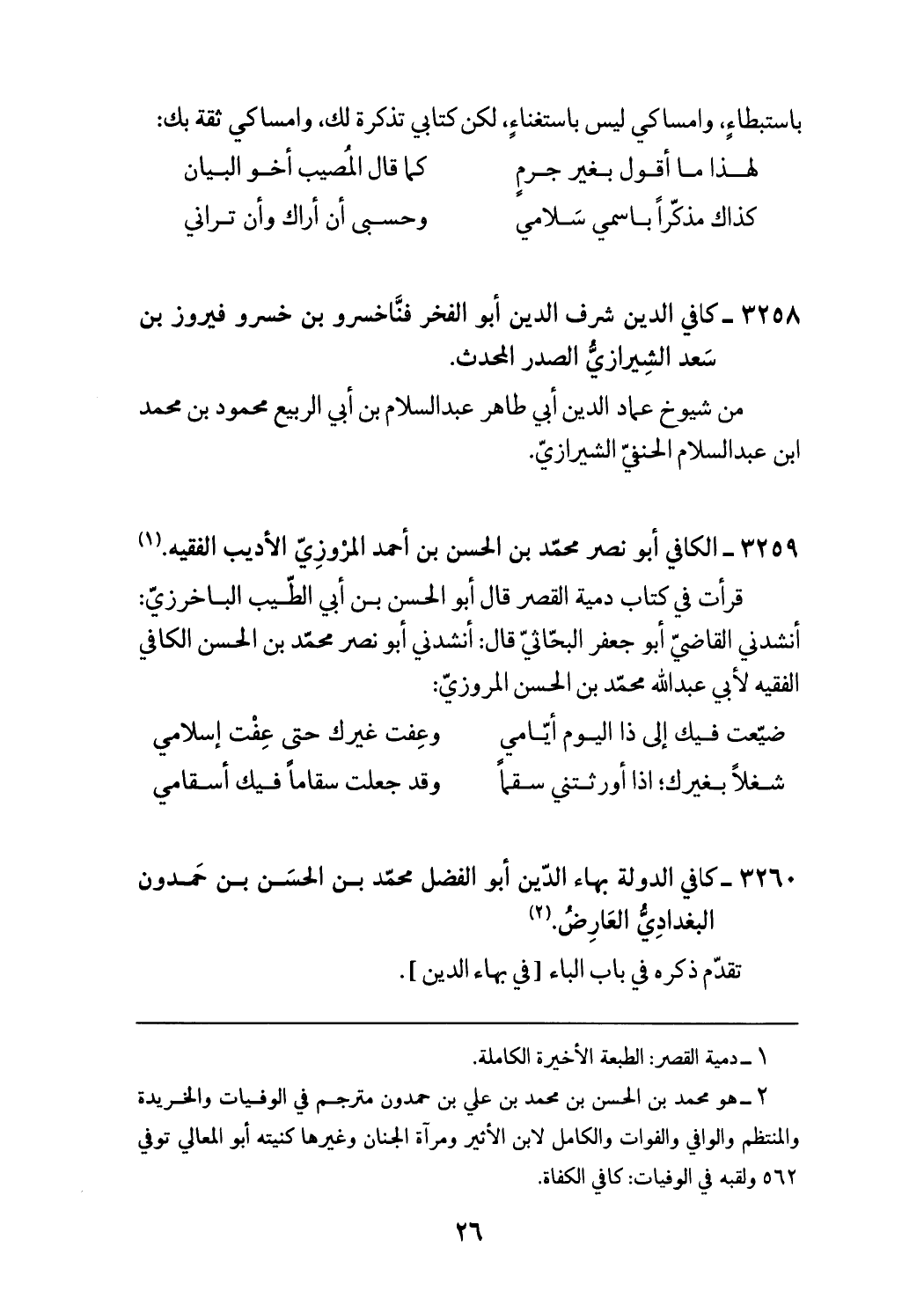 (¬2) هو محمد بن الحسن بن محمد بن علي بن حمدون مترجم في الوفيات والخريدة والمنتظم والوافي والفوات والكامل لابن الأثير ومرآة الجنان وغيرها كنيته أبو المعالي توفي 562 ولقبه في الوفيات: كافي الكفاة.