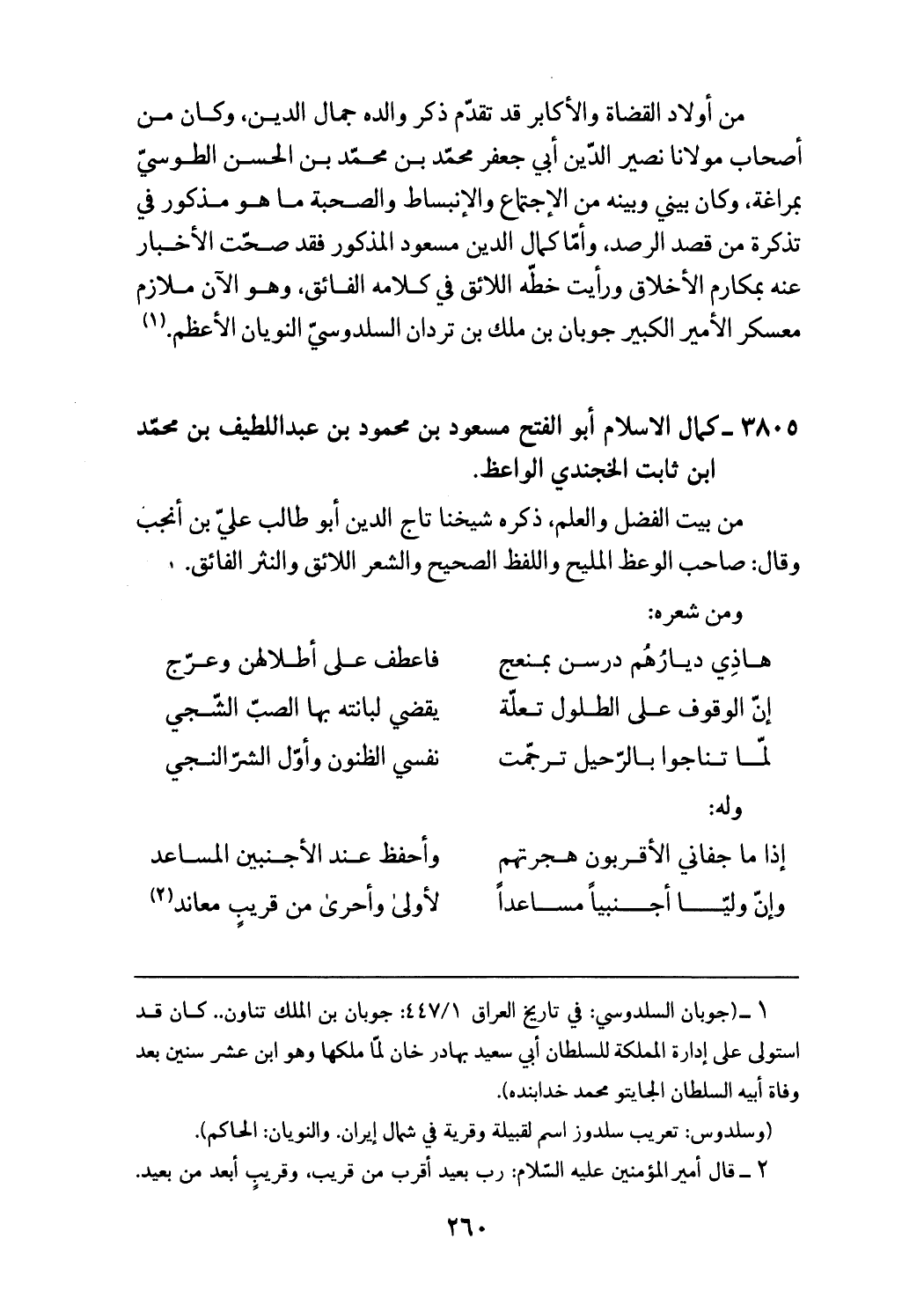 من أولاد القضاة والأكابر قد تقدّم ذكر والده جمال الدين، وكان من أصحاب مولانا نصير الدّين أبي جعفر محمّد بن محمّد بن الحسن الطوسيّ بمراغة، وكان بيني وبينه من الاجتماع والانبساط والصحبة ما هو مذكور في تذكرة من قصد الرصد، وأمّا كمال الدين مسعود المذكور فقد صحّت الأخبار عنه بمكارم الأخلاق ورأيت خطّه اللائق في كلامه الفائق، وهو الآن ملازم معسكر الأمير الكبير جوبان بن ملك بن تردان السلدوسيّ النويان الأعظم. (¬1)