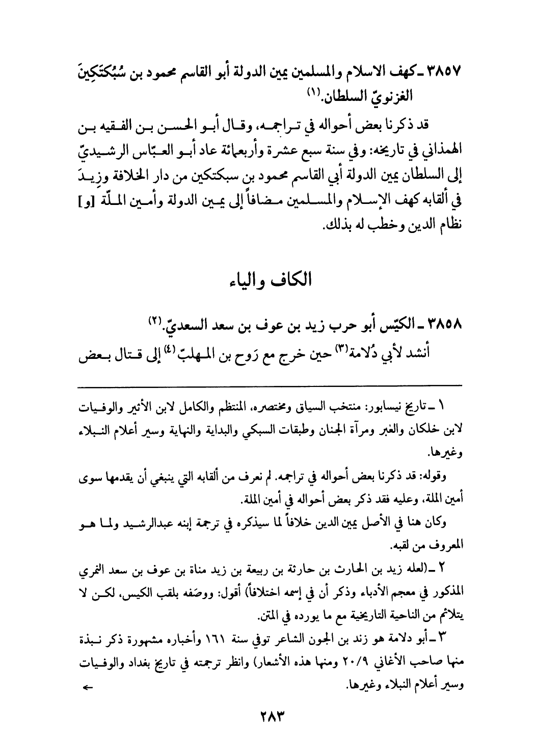 (¬2) (لعله زيد بن الحارث بن حارثة بن ربيعة بن زيد مناة بن عوف بن سعد النمري المذكور في معجم الأدباء وذكر أن في اسمه اختلافا) أقول: ووصفه بلقب الكيس، لكن لا يتلائم من الناحية التاريخية مع ما يورده في المتن.