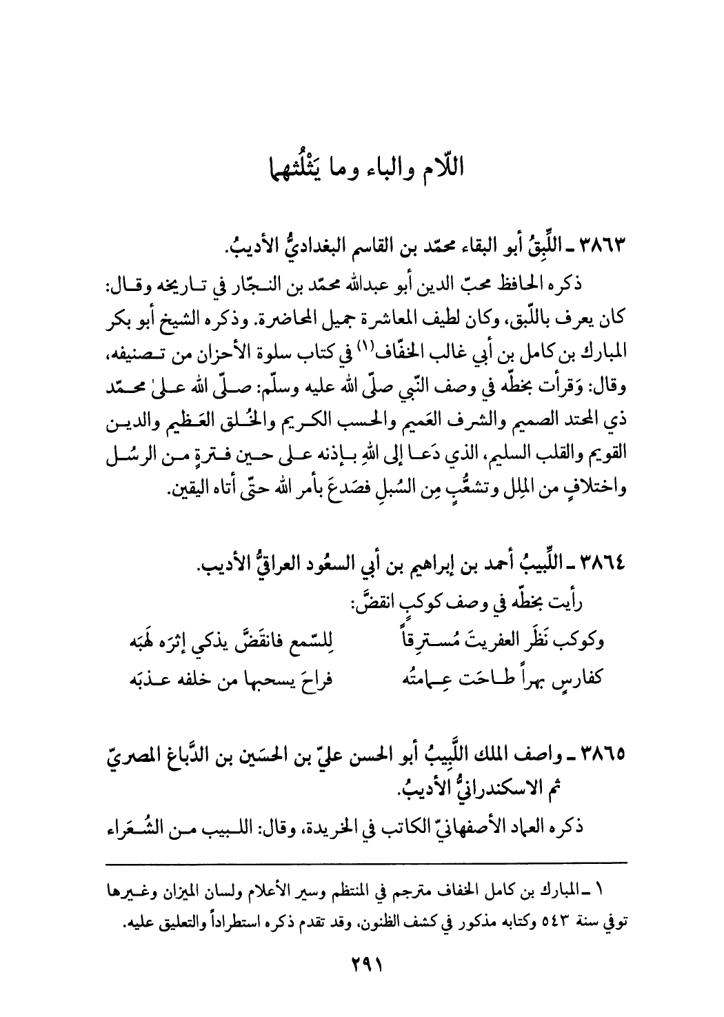 (¬1) المبارك بن كامل الخفاف مترجم في المنتظم وسير الأعلام ولسان الميزان وغيرها توفي سنة 543 وكتابه مذكور في كشف الظنون، وقد تقدم ذكره استطرادا والتعليق عليه.