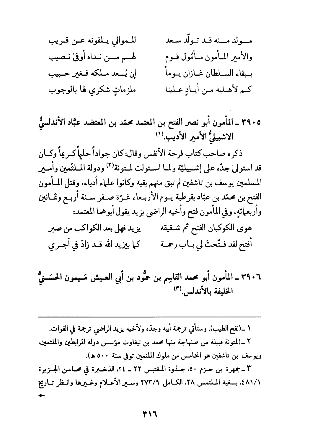 ذكره صاحب كتاب فرحة الأنفس وقال: كان جوادا حليما كريما وكان قد استولى جدّه على إشبيليّة ولما استولت لمتونة (¬2) ودولة الملثّمين وأمير المسلمين يوسف بن تاشفين لم تبق منهم بقية وكانوا علماء أدباء، وقتل المأمون الفتح بن محمّد بن عبّاد بقرطبة يوم الأربعاء غرّة صفر سنة أربع وثمانين وأربعمائة، وفي المأمون فتح وأخيه الراضي يزيد يقول أبوهما المعتمد: