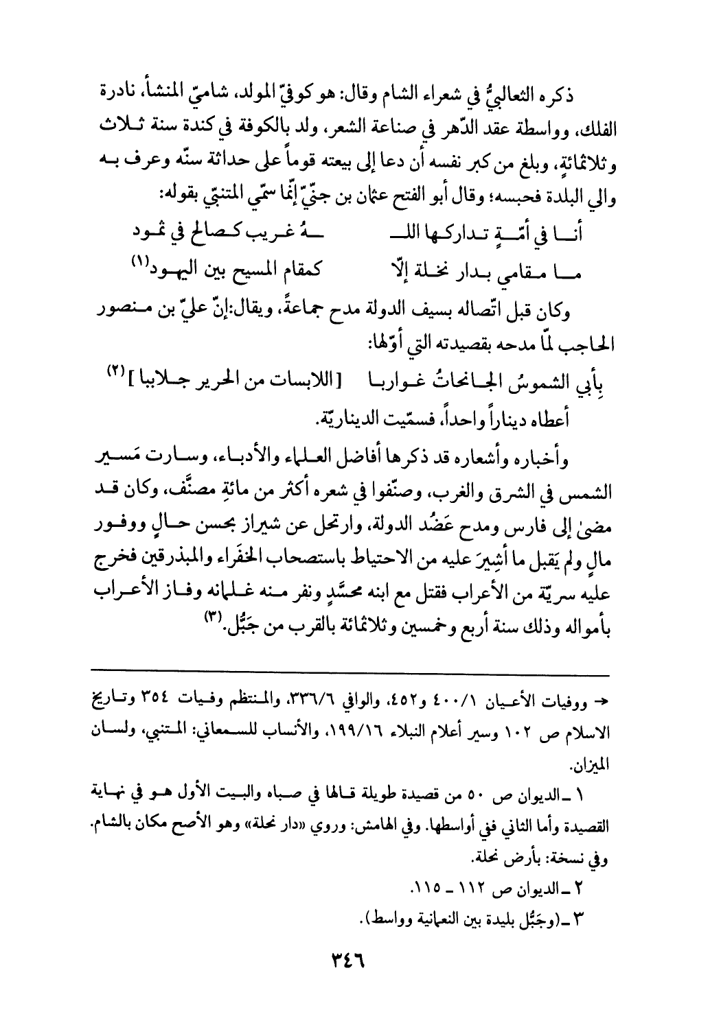 = ووفيات الأعيان 400/ 1 و 452، والوافي 336/ 6، والمنتظم وفيات 354 وتاريخ الاسلام ص 102 وسير أعلام النبلاء 199/ 16، والأنساب للسمعاني: المتنبي، ولسان الميزان.