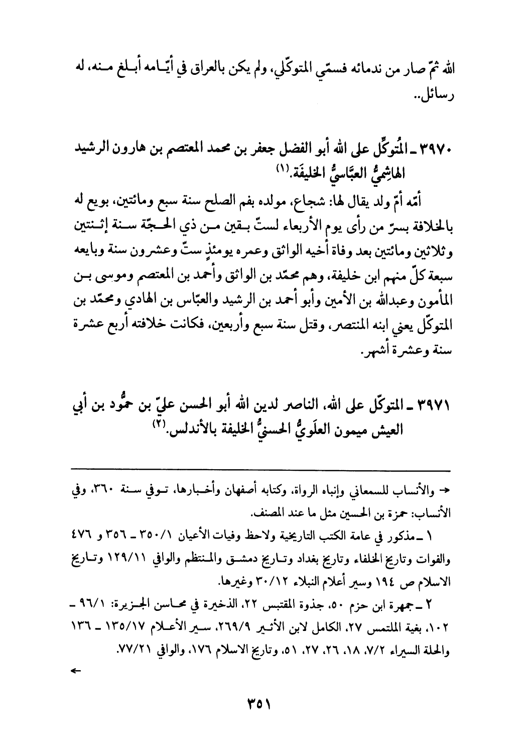 (¬1) مذكور في عامة الكتب التاريخية ولاحظ وفيات الأعيان 350/ 1 - 356 و 476 والفوات وتاريخ الخلفاء وتاريخ بغداد وتاريخ دمشق والمنتظم والوافي 129/ 11 وتاريخ الاسلام ص 194 وسير أعلام النبلاء 30/ 12 وغيرها.