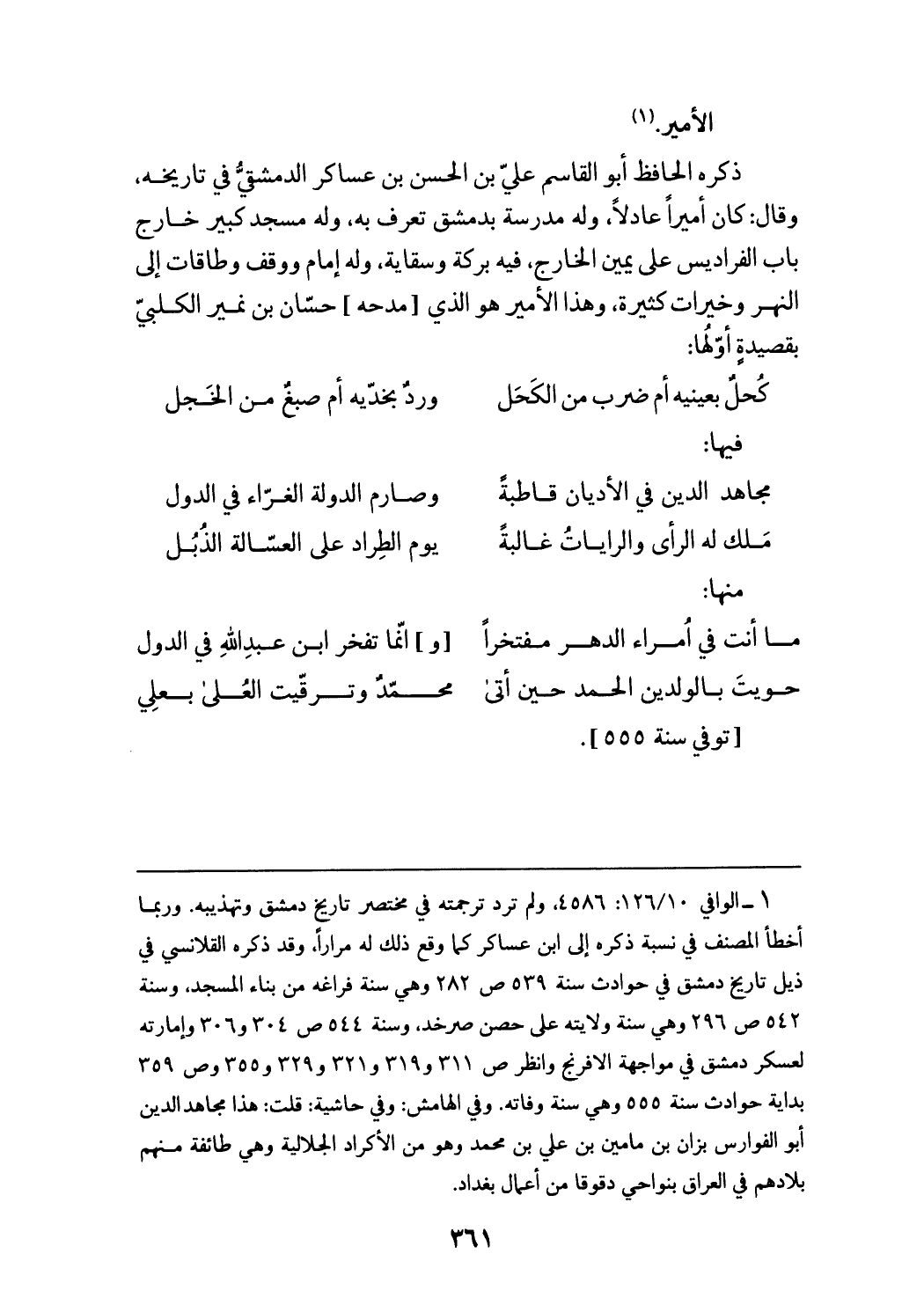 (¬1) الوافي 126/ 10: 4586، ولم ترد ترجمته في مختصر تاريخ دمشق وتهذيبه. وربما أخطأ المصنف في نسبة ذكره إلى ابن عساكر كما وقع ذلك له مرارا، وقد ذكره القلانسي في ذيل تاريخ دمشق في حوادث سنة 539 ص 282 وهي سنة فراغه من بناء المسجد، وسنة 542 ص 296 وهي سنة ولايته على حصن صرخد، وسنة 544 ص 304 و 306 وإمارته لعسكر دمشق في مواجهة الافرنج وانظر ص 311 و 319 و 321 و 329 و 355 وص 359 بداية حوادث سنة 555 وهي سنة وفاته. وفي الهامش: وفي حاشية: قلت: هذا مجاهد الدين أبو الفوارس بزان بن مامين بن علي بن محمد وهو من الأكراد الجلالية وهي طائفة منهم بلادهم في العراق بنواحي دقوقا من أعمال بغداد.
