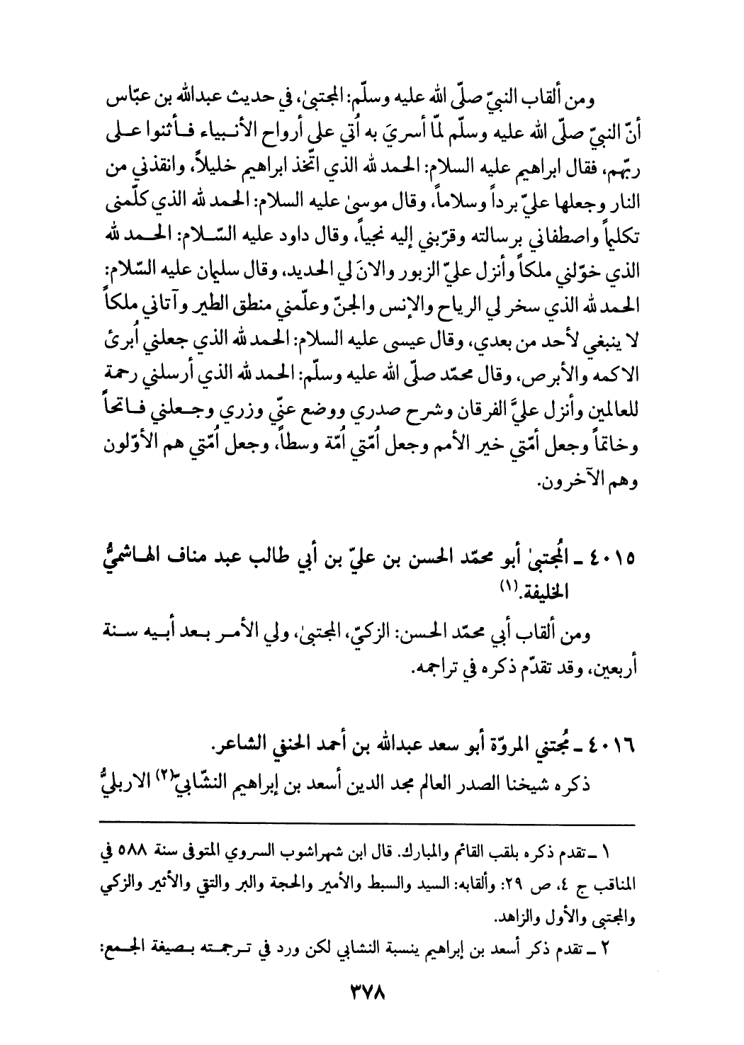 ومن ألقاب النبيّ صلّى الله عليه وسلّم: المجتبى، في حديث عبد الله بن عبّاس أنّ النبيّ صلّى الله عليه وسلّم لمّا أسري به اتي على أرواح الأنبياء فأثنوا على ربّهم، فقال ابراهيم عليه السلام: الحمد لله الذي اتّخذ ابراهيم خليلا، وانقذني من النار وجعلها عليّ بردا وسلاما، وقال موسى عليه السلام: الحمد لله الذي كلّمنى تكليما واصطفاني برسالته وقرّبني إليه نجيا، وقال داود عليه السّلام: الحمد لله الذي خوّلني ملكا وأنزل عليّ الزبور والان لي الحديد، وقال سليمان عليه السّلام: